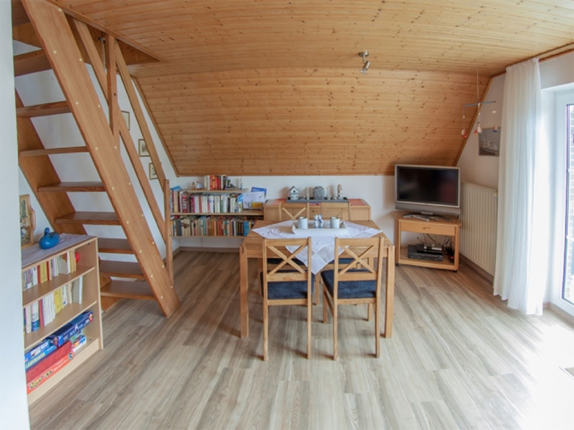 Vom Wohnzimmer aus gelangen Sie über eine etwas steilere, offenen Holztreppe ins gemütlich ausgebaute Dachgeschoss mit weiteren 2 Schlafräumen mit je 2 Einzelbetten. Im größeren Schlafbereich bieten wir zusätzlich einen Flachbild-Fernseher und einen DVD-Player.