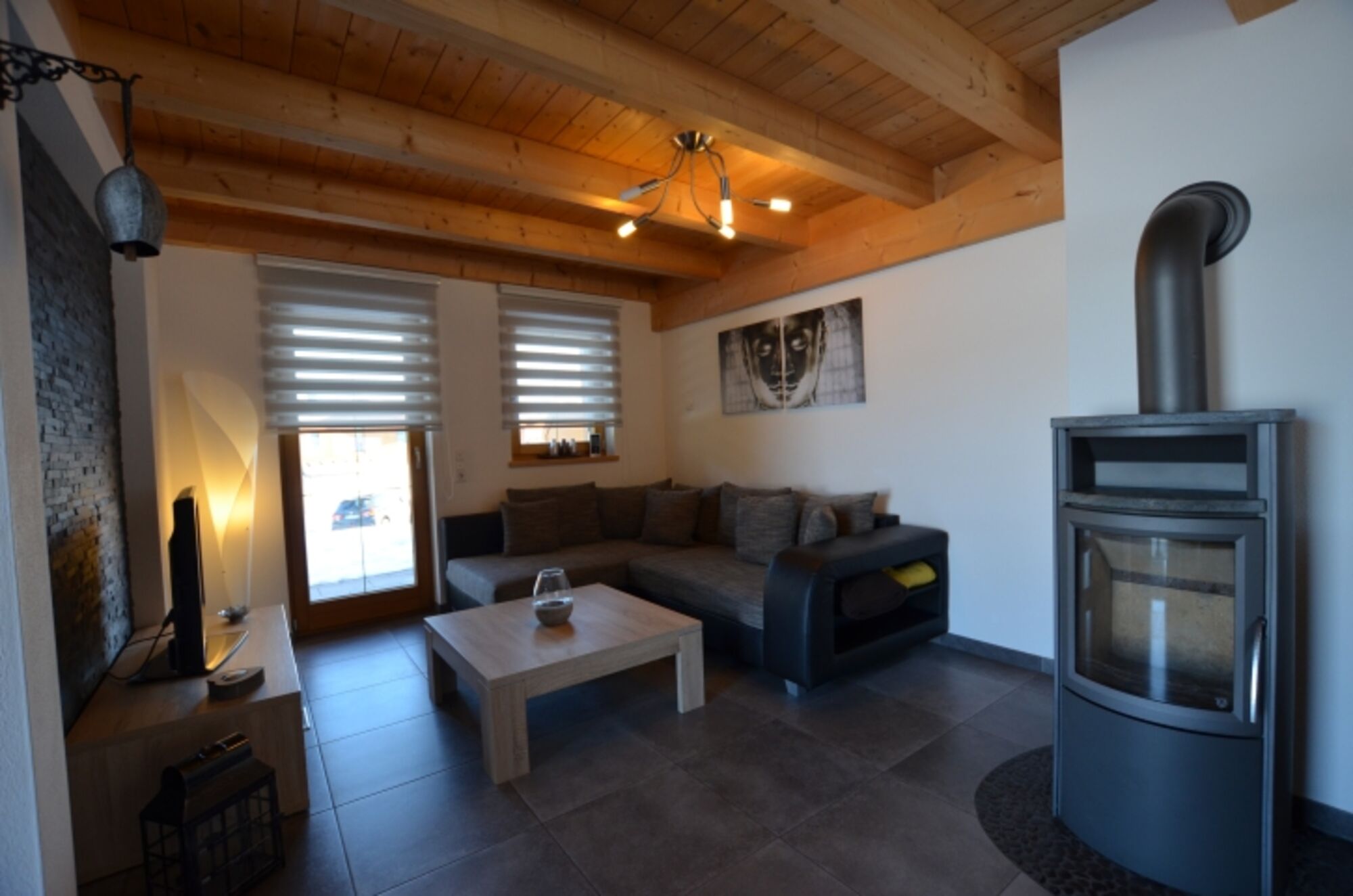 TV-Sat, TV-Flachbildschirm, Kaminofen, Eckcouch