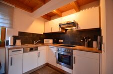 4-Platten Herd, Cerankochfeld, Dunstabzugshaube, Kühlschrank mit Gefrierfach, Senseo-Kaffeeautomat, Korkenzieher / Flaschenöffner, Essplatz in der Küche
