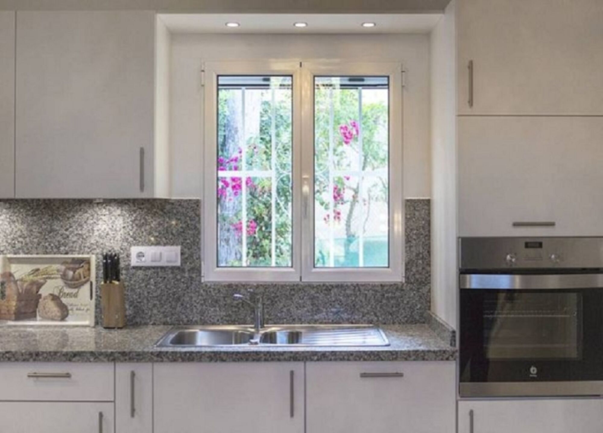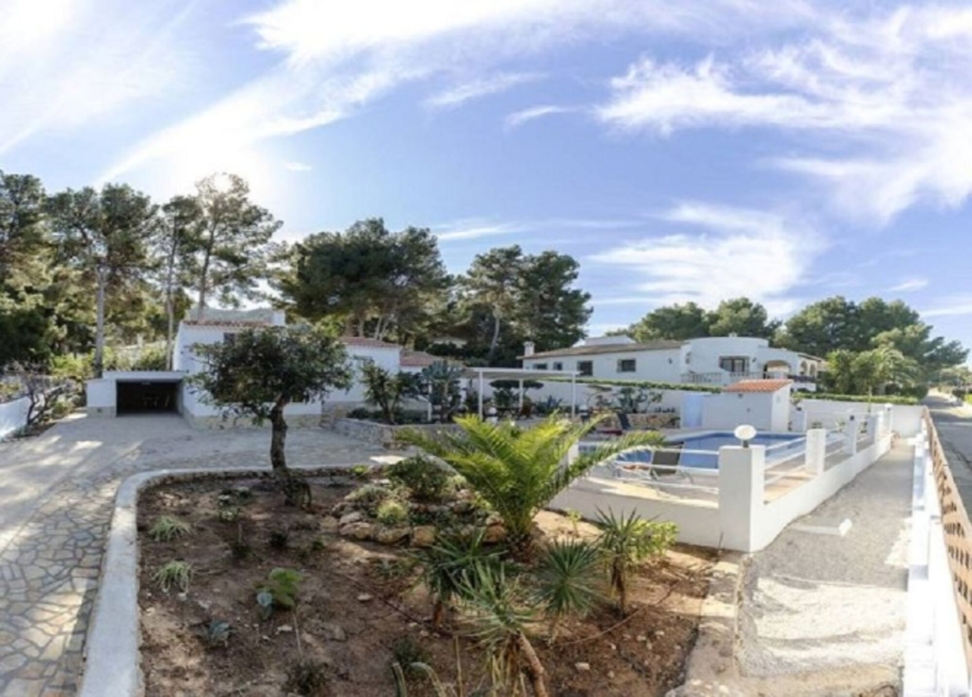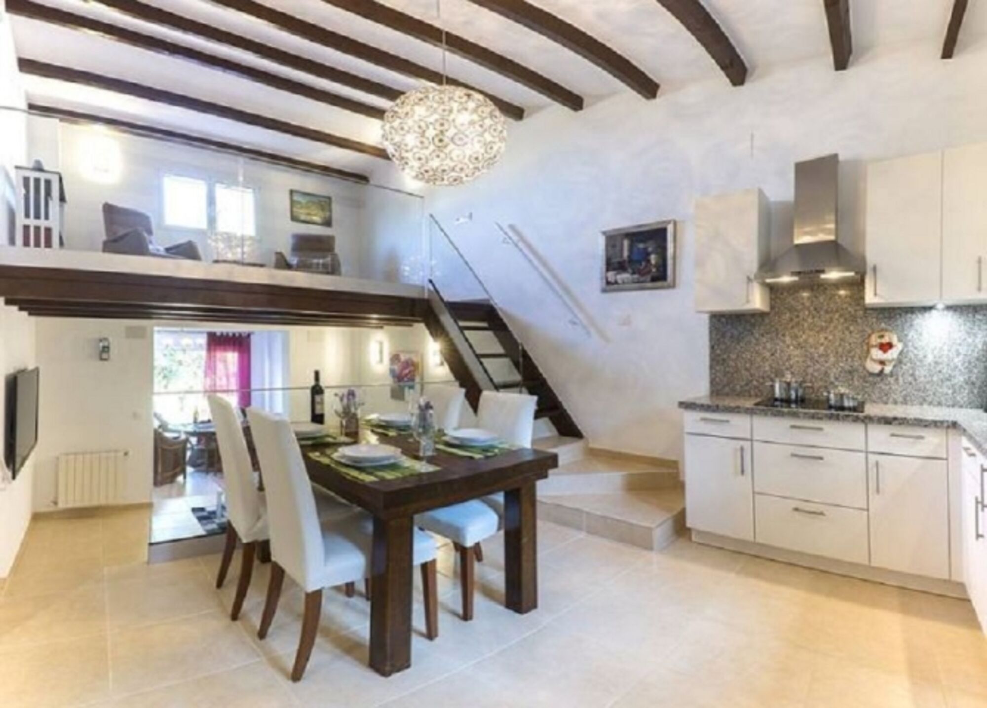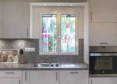 Wir bieten Ihnen ein freistehendes Haus mit ca. 120qm Wohnfläche und einer Grundstücksgröße von 850 qm, 3 Klima-Anlgen mit Heizfunktion, Gas-Zentralheizung. 2 Schlafzimmer, 1 Duschbad, 1 grosses WC mit Waschtisch, eine offene Wohnküche mit anschließendem Wohnzimmer mit TV, eine kleine Galerie als schöner Platz zum Arbeiten oder Lesen und einen hellen Raum mit Meerblick zum gemütlichen Sitzen. Von der Strasse eine Zufahrt mit elektrischem Tor zu einer Garage. Die Zufahrt kann auch als Abstellplatz für weitere Autos genutzt werden. Am Außeneingang befindet sich eine Sprechanlage mit Kamera. Die Villa Marquesa bietet 2 Eingänge. Einmal im vorderen Teil des Hauses zur Strasse und zur Poolterrasse hin, Pool 4x8m, und einmal hinter dem Haus. Der Eingang hinter dem Haus führt Sie in einen kleinen Flur. Von dort geht es weiter nach rechts in eine Wohnküche mit einem Echtholztisch für 4 Personen.