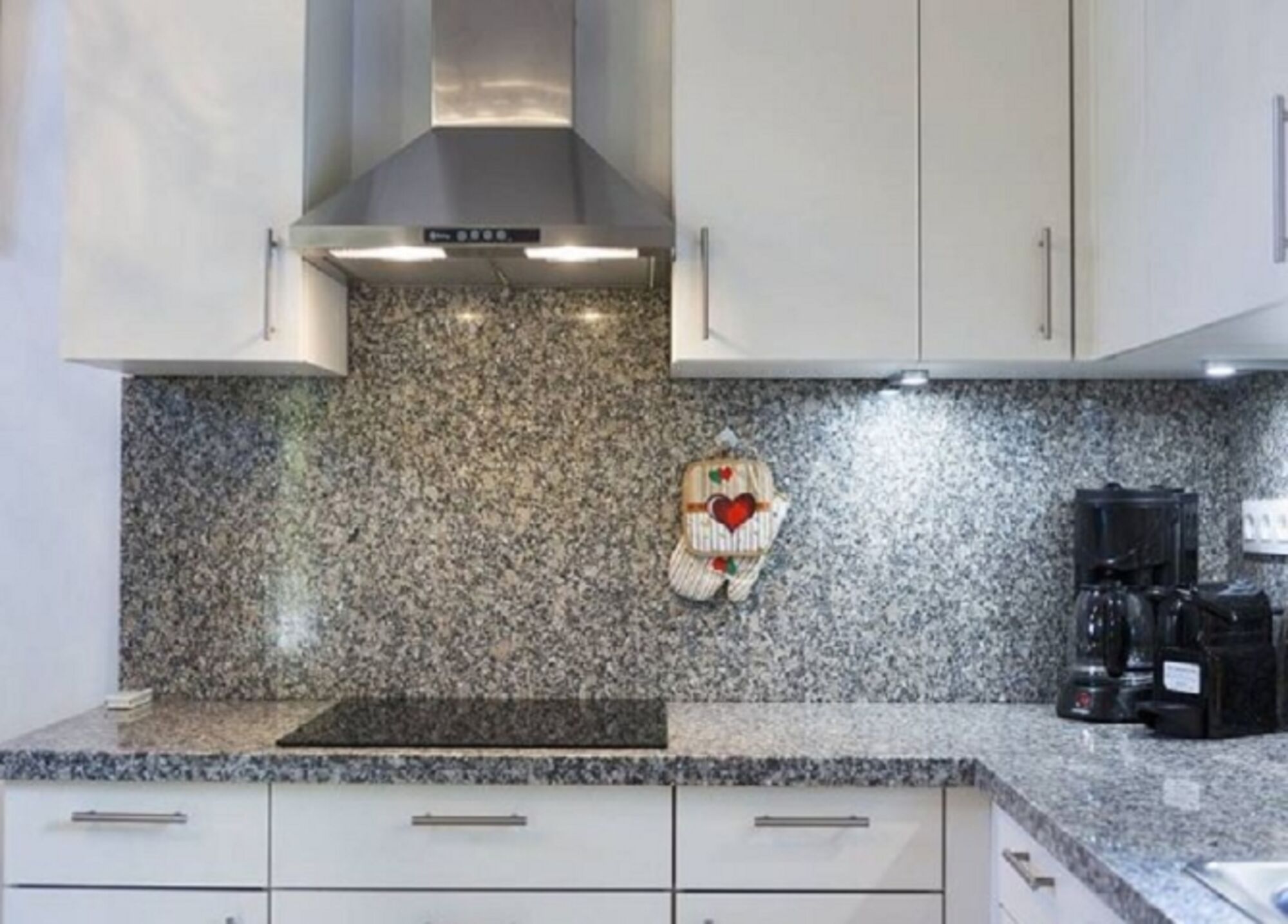 Cerankochfeld, Dunstabzugshaube, Kühlschrank mit Gefrierfach, Nespresso-Automat, Korkenzieher / Flaschenöffner, Gewürze (Salz, Pfeffer, Zucker), Öl / Essig, Geschirrhandtücher, Mülltüten, Essplatz in der Küche