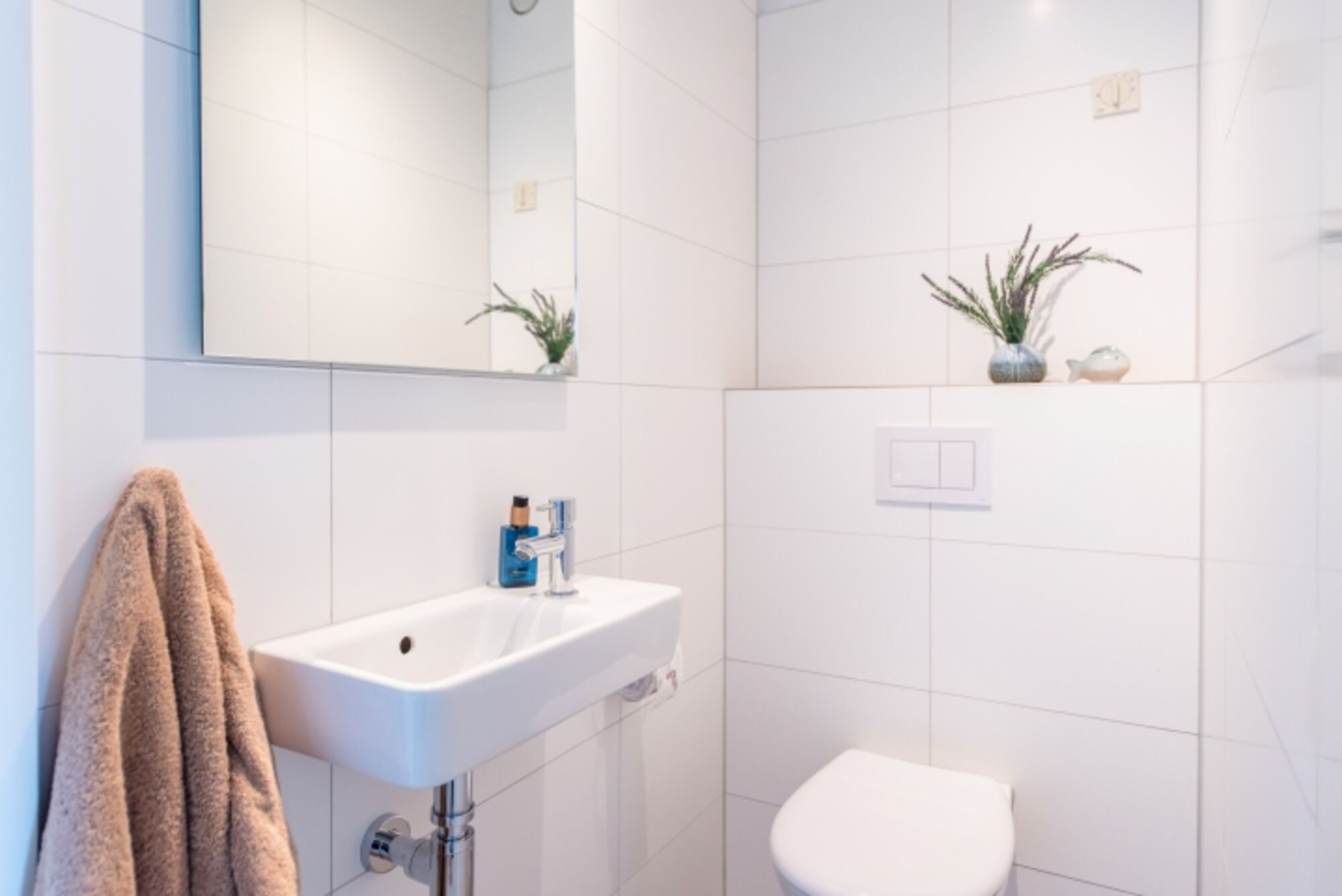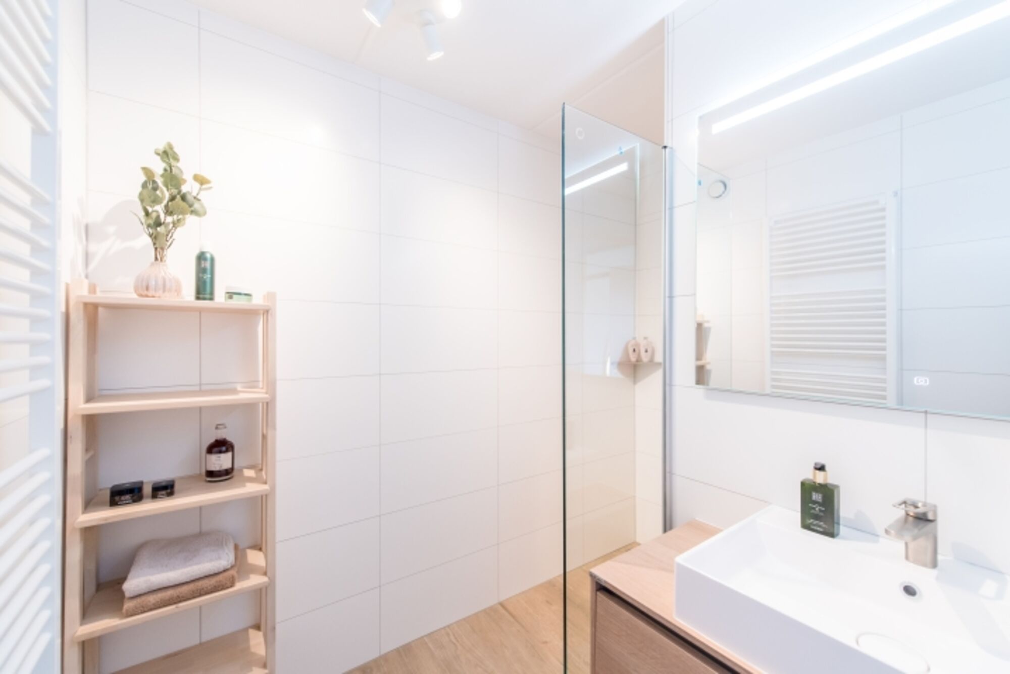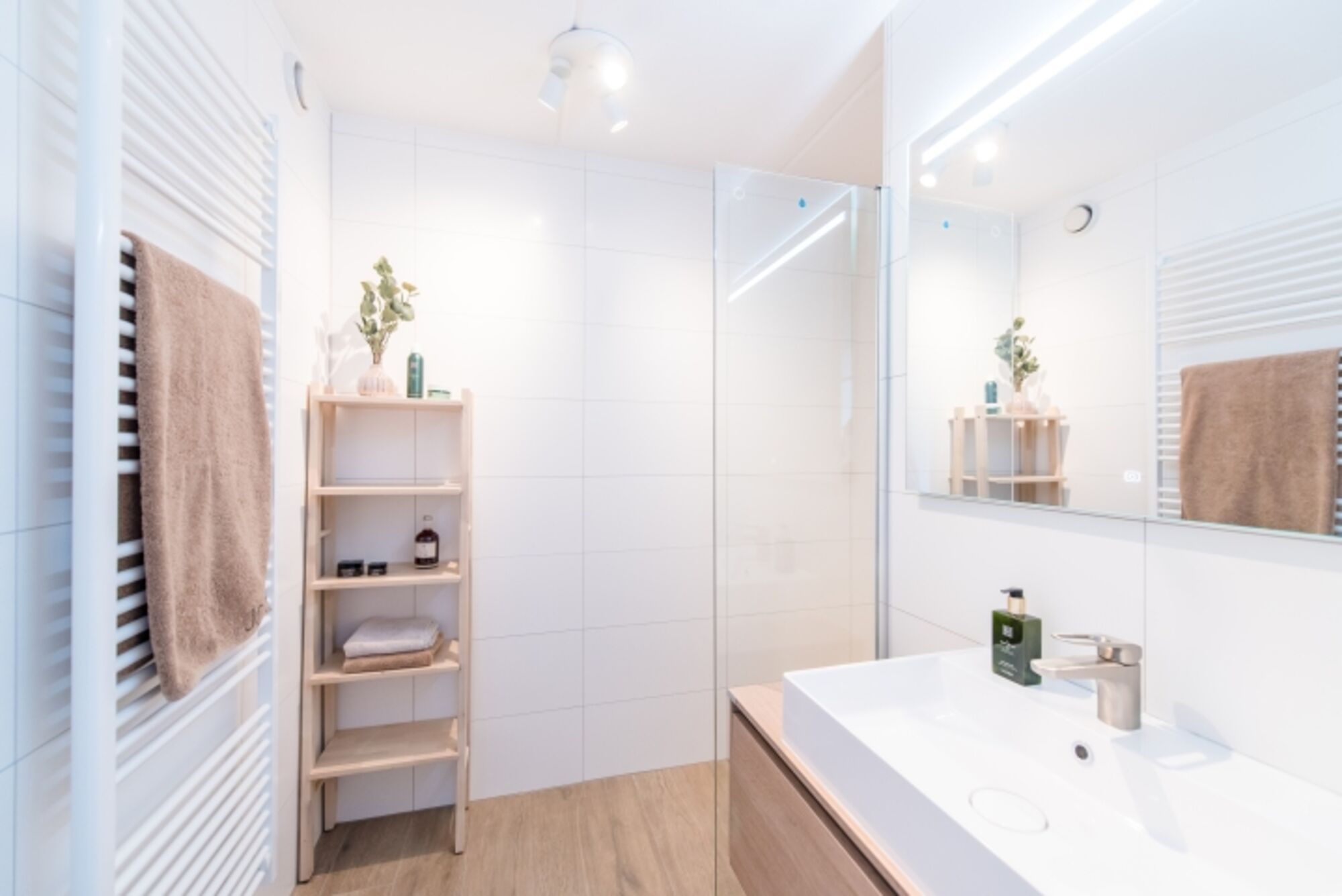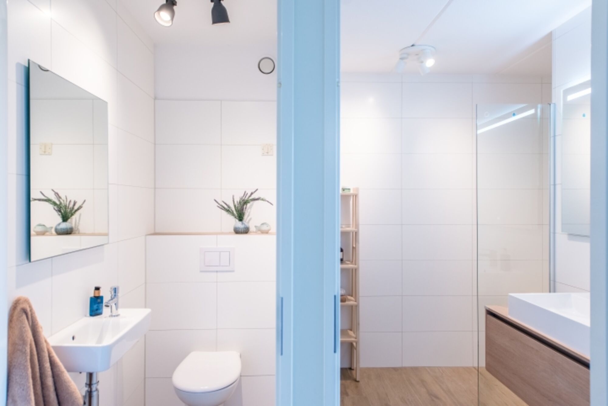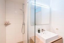 Das moderne Badezimmer ist mit einer Duschkabine und einem Waschbecken ausgestattet. Ein Föhn ist vorhanden. Das WC ist separat.