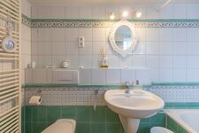 Das romantisch eingerichtete Badezimmer befindet sich im Erdgeschoss. Es ist komfortabel ausgestattet mit einer Badewanne mit Duschvorrichtung, Waschbecken und WC. Eine Handtuchheizung und genügend Abstellmöglichkeiten sind ebenfalls vorhanden.