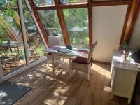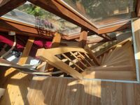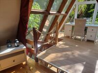 Im Obergeschoss gelangen Sie über eine offene Holztreppe in den oberen Bereich des Wintergartens, der mit einem Arbeitsplatz und einer offenen Galerie ausgestattet ist. Außerdem befinden sich im Obergeschoss, angrenzend an die Galerie, zwei Schlafzimmer.