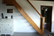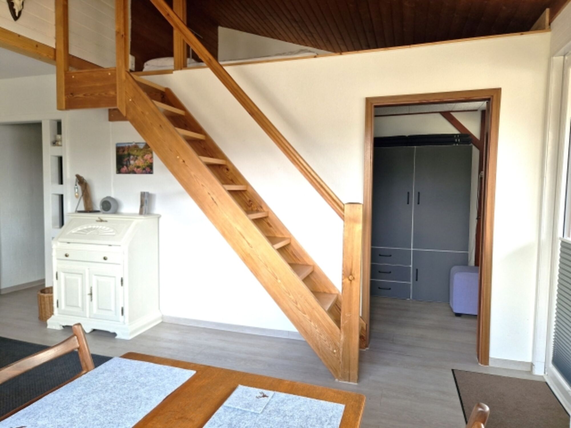 Vom Wohnbereich führt eine Tür zu einem kleinen Zimmer, das mit einem komfortablen 140x200 cm Bett ausgestattet ist. Eine Treppe nach oben eröffnet den Zugang zur Galerie, wo sich eine weitere Schlafmöglichkeit mit einem großzügigen 180x200 cm Bett (2x90x200 cm) befindet. Hier lassen sich erholsame Nächte genießen.