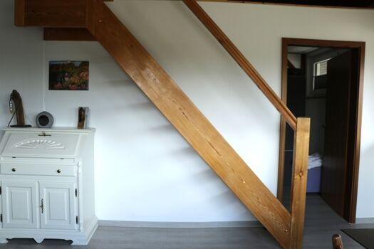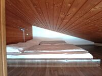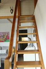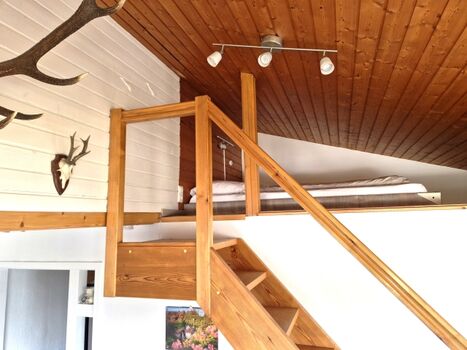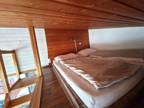 Eine Treppe nach oben eröffnet den Zugang zur Galerie, wo sich eine weitere Schlafmöglichkeit mit einem großzügigen 180x200 cm Bett (2x90x200 cm) befindet. Die Galerie ist über dem kleinen Schlafzimmer. Hier lassen sich erholsame Nächte genießen. Doppelbett 1,80 x 2,00m, Wecker, Leselampe am Bett