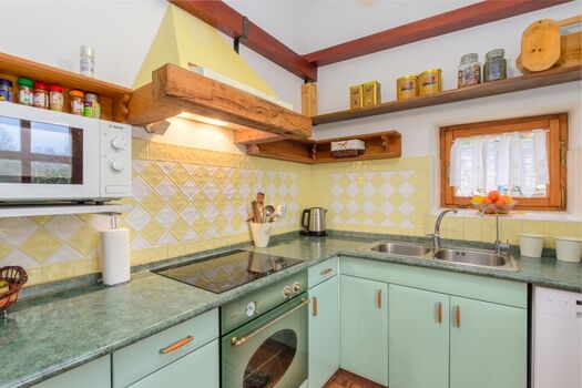 Cerankochfeld, Kühlschrank mit Gefrierfach, Mixer, Eismaschine, Geschirrhandtücher