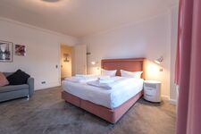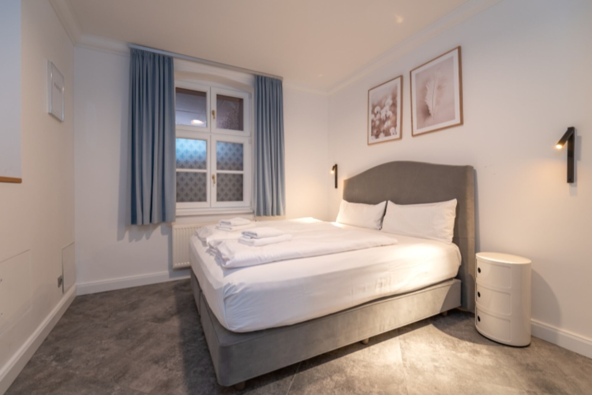 Das Appartement verfügt über zwei Schlafzimmer, die beide mit hochwertigen und handgefertigten englischen Boxspring-Betten ausgestattet (1,80m breit und 1,60m breit) sind. Alle Fenster sind selbstverständlich abdunkelbar, so dass einem ruhigen Schlaf nichts im Wege steht. Ein großer Kleiderschrank sowie ein zweiter Fernseher komplementieren das Schlafzimmer, von dem aus Sie ebenfalls die überdachte Terrasse erreichen.