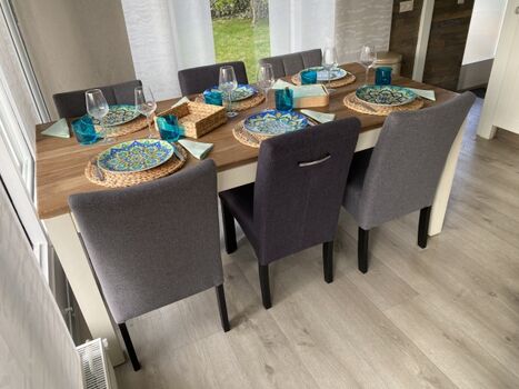 Der Ferienbungalow verfügt über ein großes, geselliges Wohnzimmer, wo Sie mit Ihrer Familie herrliche Abende zusammen verbringen können. In der komplett eingerichteten offenen Küche mit Essecke, genießen Sie von Ihren Mahlzeiten oder könne Sie mit Ihre Kindern Spiele spielen. Das Badezimmer im Erdgeschoss verfügt über ein Waschbecken, Dusche und Toilette.