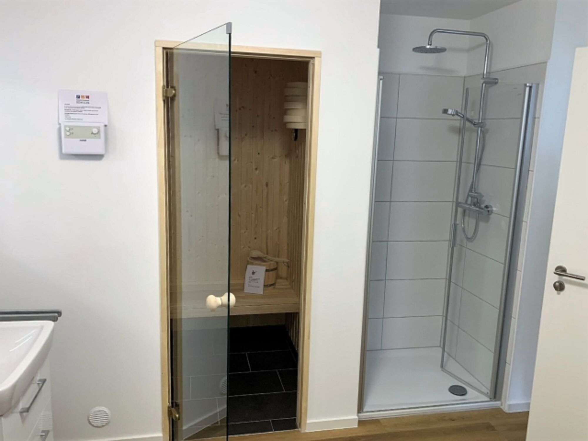 Eine Sauna, eine Regendusche und eine Badewanne bieten den nötigen Komfort zur Erholung.