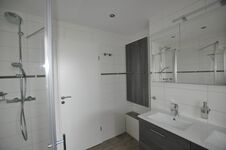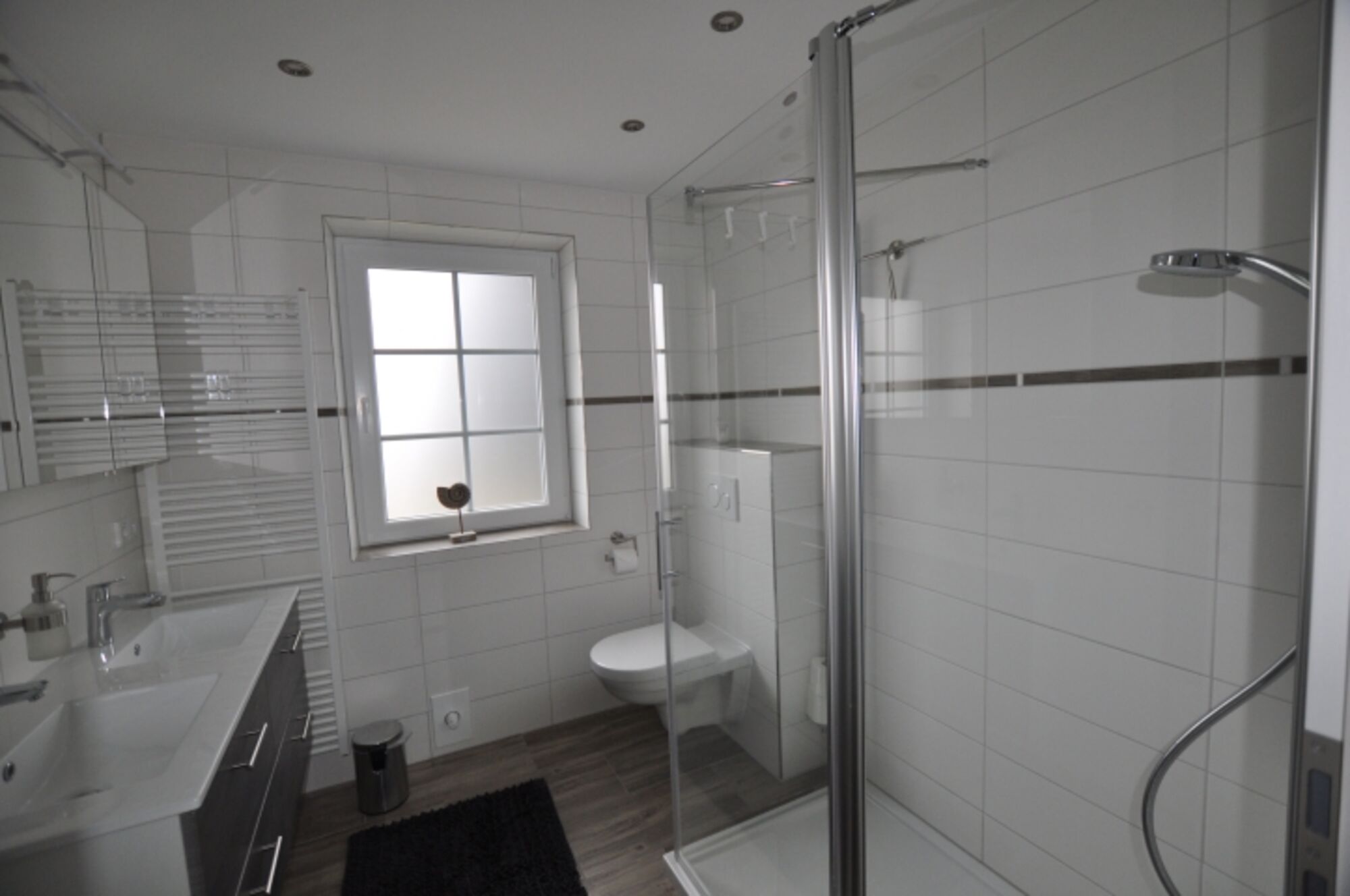 Doppelwaschbecken, Regendusche, Spiegel, Fenster im Bad