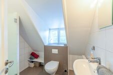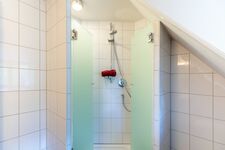 Das Badezimmer im Erdgeschoss ist über einen kleinen Flur erreichbar, es ist mit einer großen Schwalldusche, WC und Waschbecken eingerichtet.