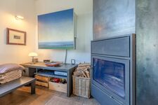 TV, Bücher, Kaminofen, 2er-Sofa, Sessel