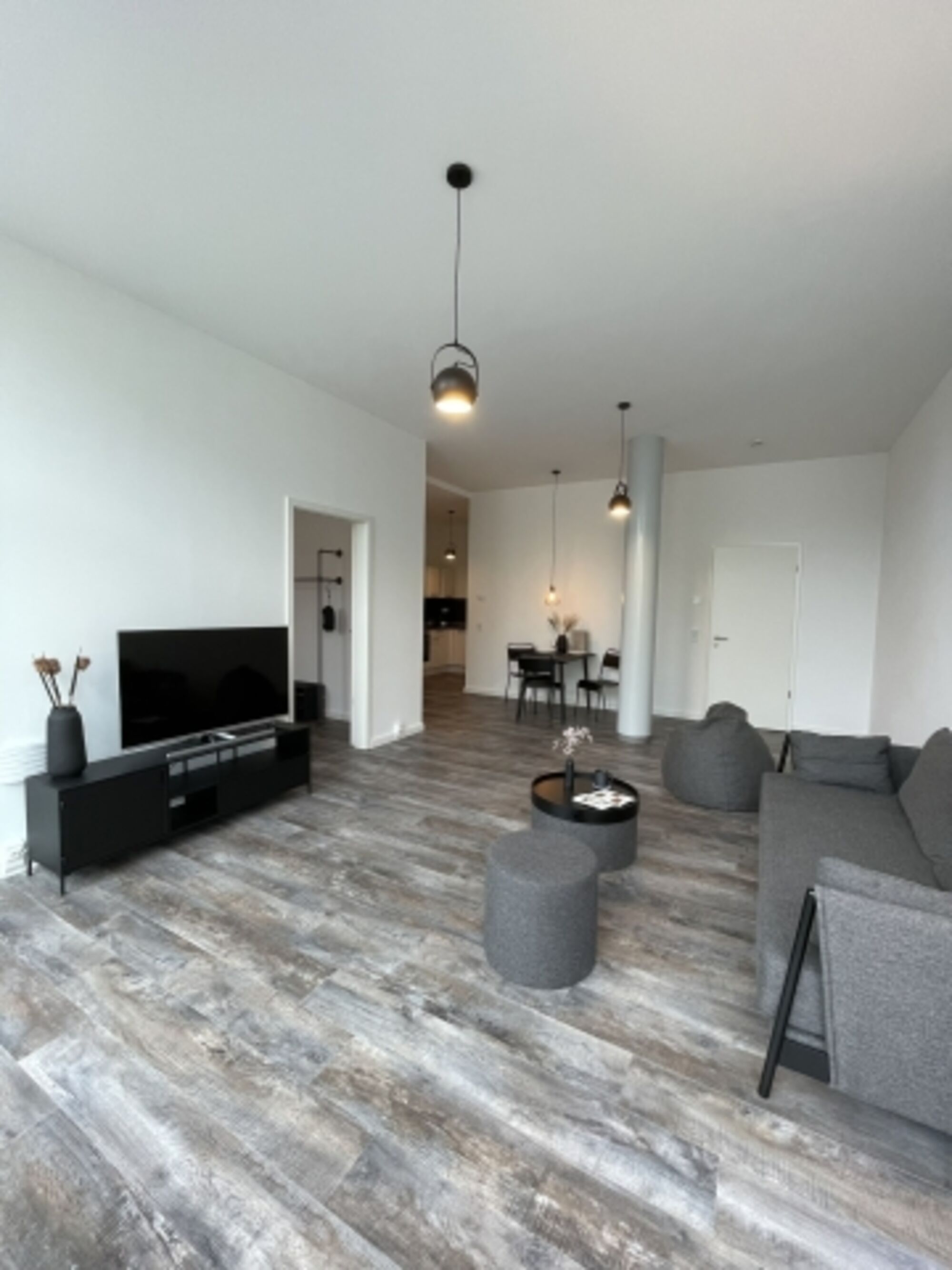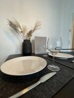 Der großzügige Wohn- und Essbereich ist mit einem Sofa sowie einem Esstisch (120 cm x 70 cm) ausgestattet. Für einen gemütlichen Fernsehabend steht ein 50“ Fernseher mit Kabelanschluss für dich bereit. Auch deinen Netflix-Account kannst du darauf nutzen. In der gesamten Wohnung stellen wir dir selbstverständlich kostenlos einen schnellen, kabellosen Internetzugang zur Verfügung.