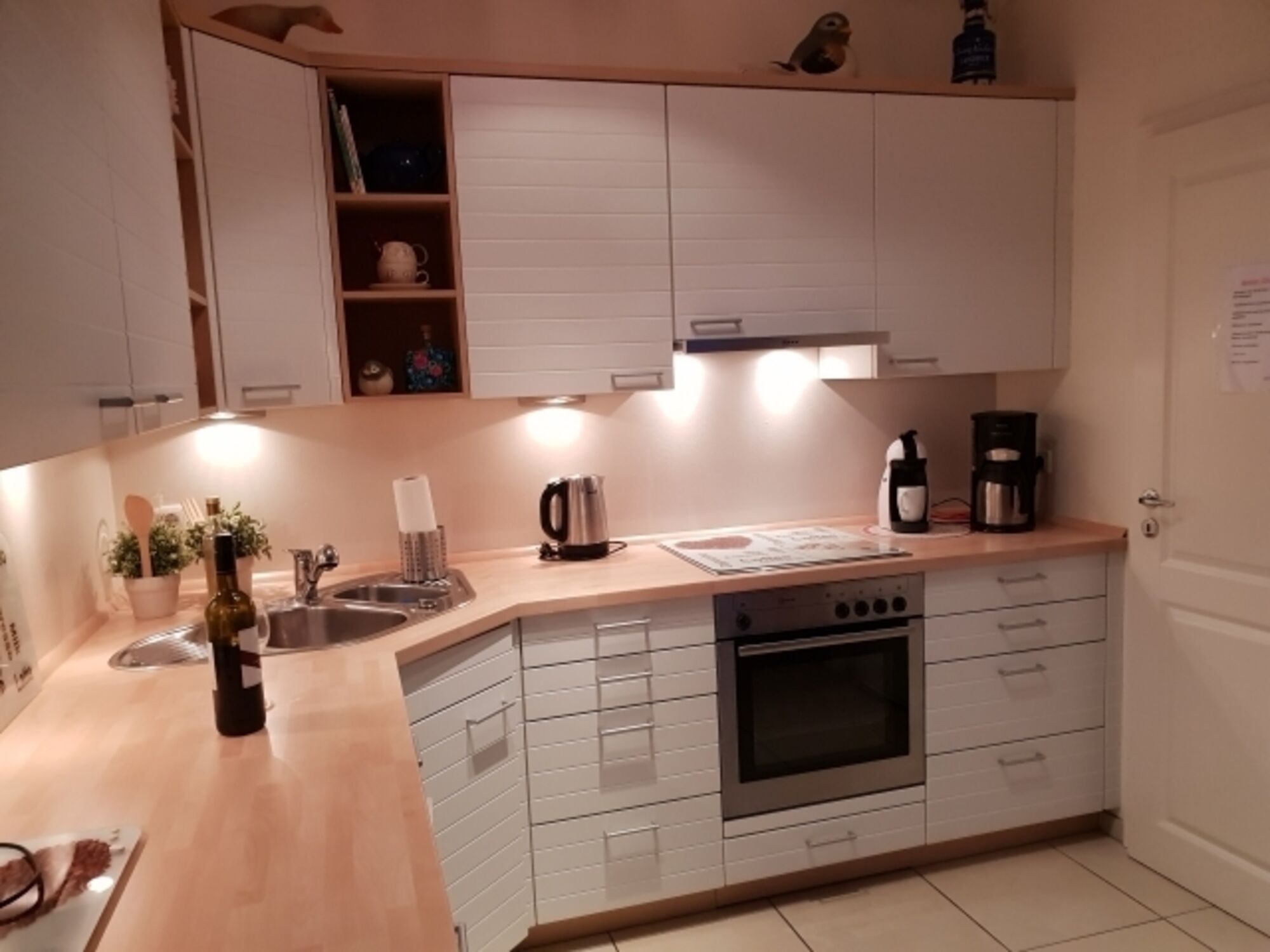Cerankochfeld, Dunstabzugshaube, Kühlschrank mit Gefrierfach, Eierkocher, Mixer, Waffeleisen, Korkenzieher / Flaschenöffner, Gewürze (Salz, Pfeffer, Zucker), Mülltüten, Essplatz in der Küche