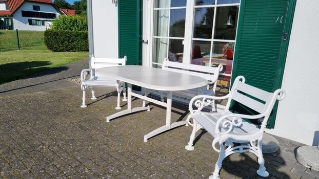 Ein Strandkorb und ausreichend Gartenmöbel sind vorhanden.