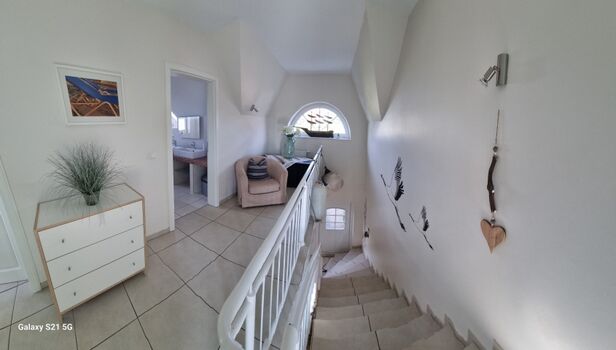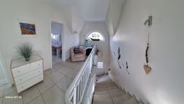 Im Obergeschoss liegt ein großes Schlafzimmer mit Balkon und Meerblick,