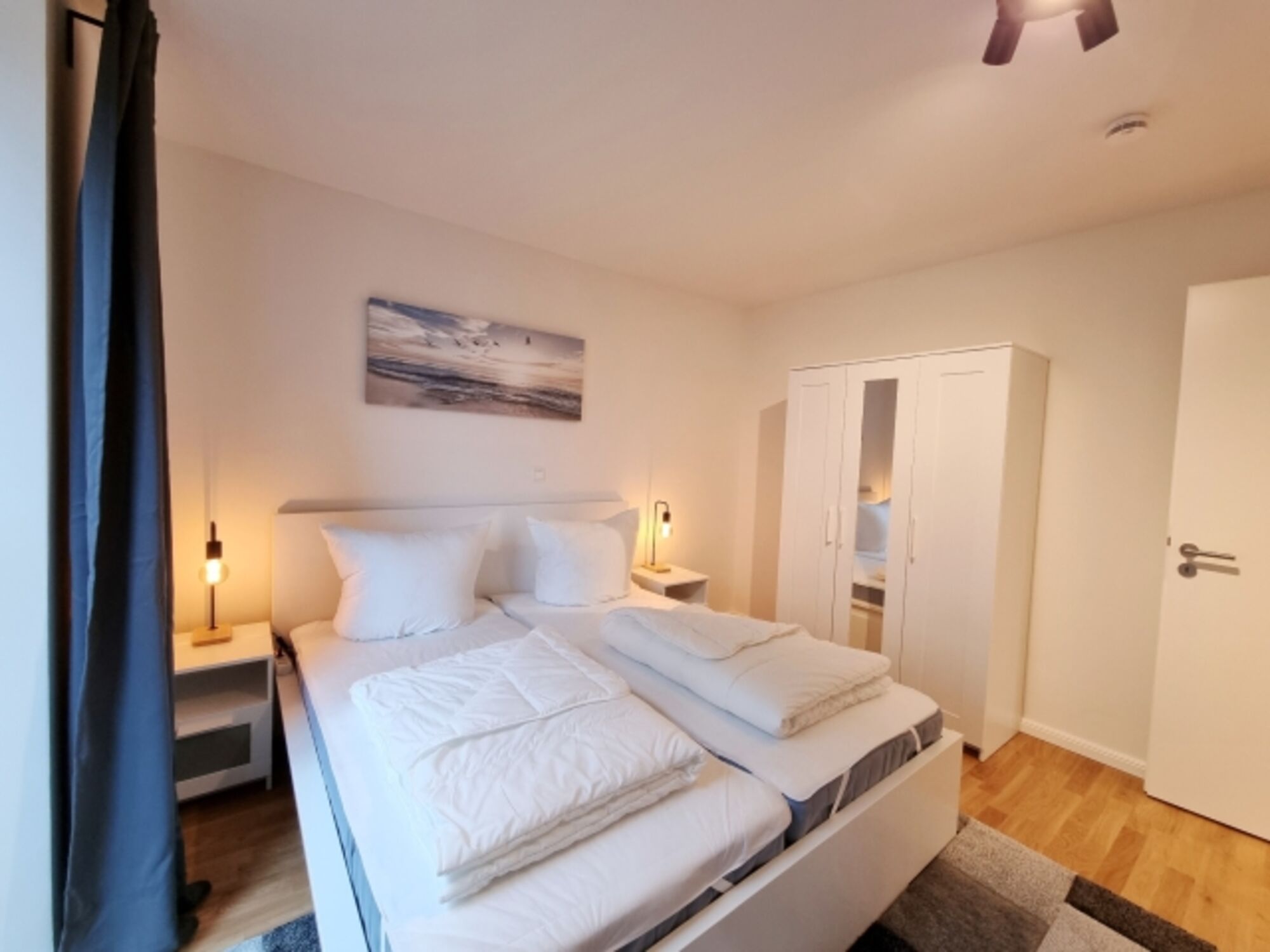 Schlafzimmer I: Doppelbett / Schrank / Kommode / Fernseher / Verdunkelungsgardinen