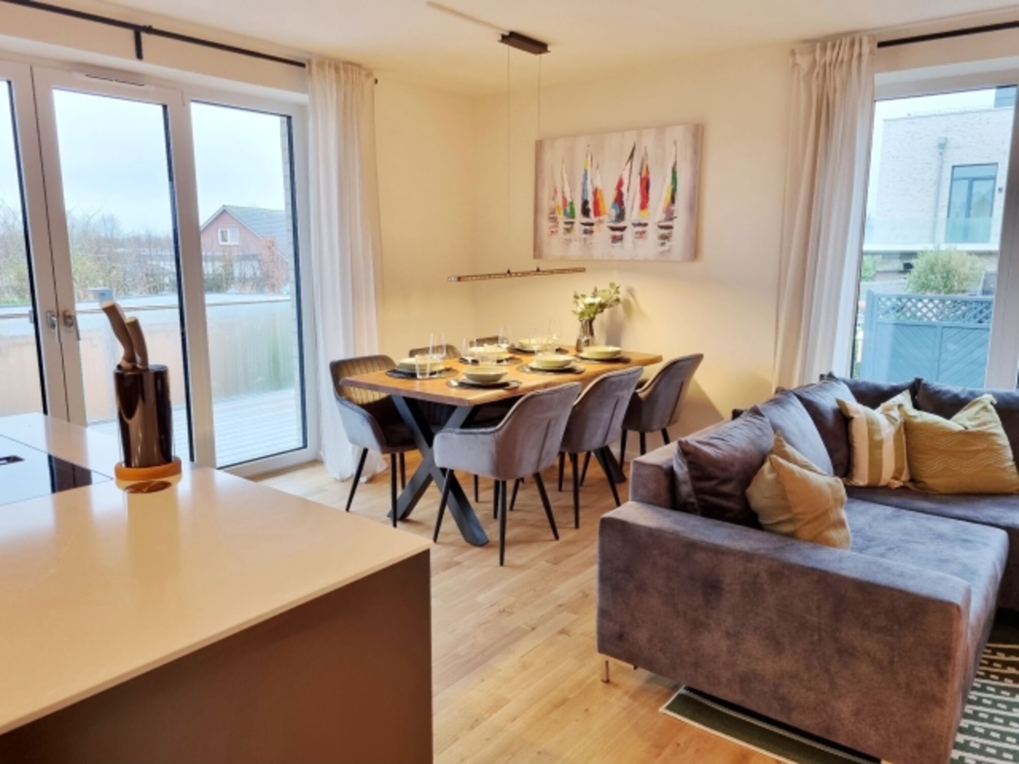 Die Ferienwohnung Seeräuber befindet sich in einer 2023 fertig gestellten Appartementanlage direkt in erster Reihe am schleswig-holsteinischen Ostseestrand.