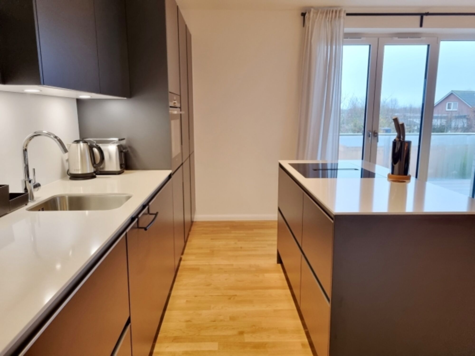 Induktionsherd, Dunstabzugshaube, Kühlschrank mit Gefrierfach, Mixer, Essplatz in der Küche