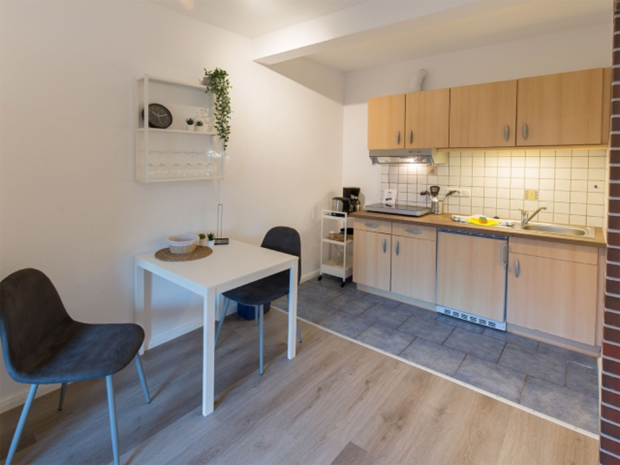 2-Platten Herd, Dunstabzugshaube, Kühlschrank mit Gefrierfach, Korkenzieher / Flaschenöffner