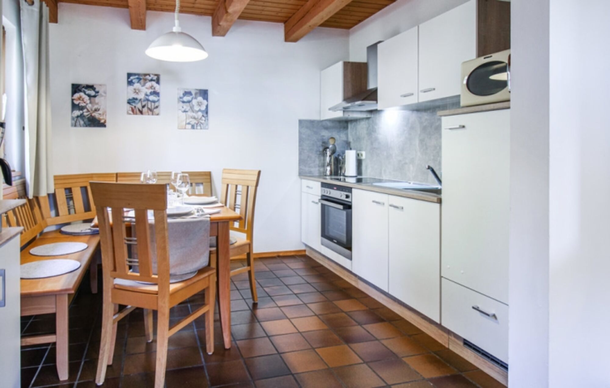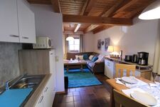 Cerankochfeld, Dunstabzugshaube, Kühlschrank mit Gefrierfach, Korkenzieher / Flaschenöffner, Gewürze (Salz, Pfeffer, Zucker), Mülltüten, Essplatz in der Küche, TV in der Küche