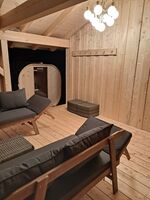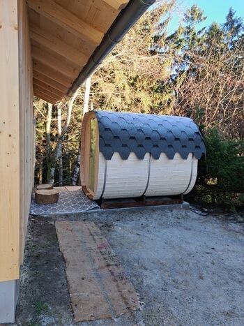 Für Saunaliebhaber haben wir im Garten eine FASSSauna aufgestellt mit großer überdachter Ruheterrasse direkt am Waldrand.