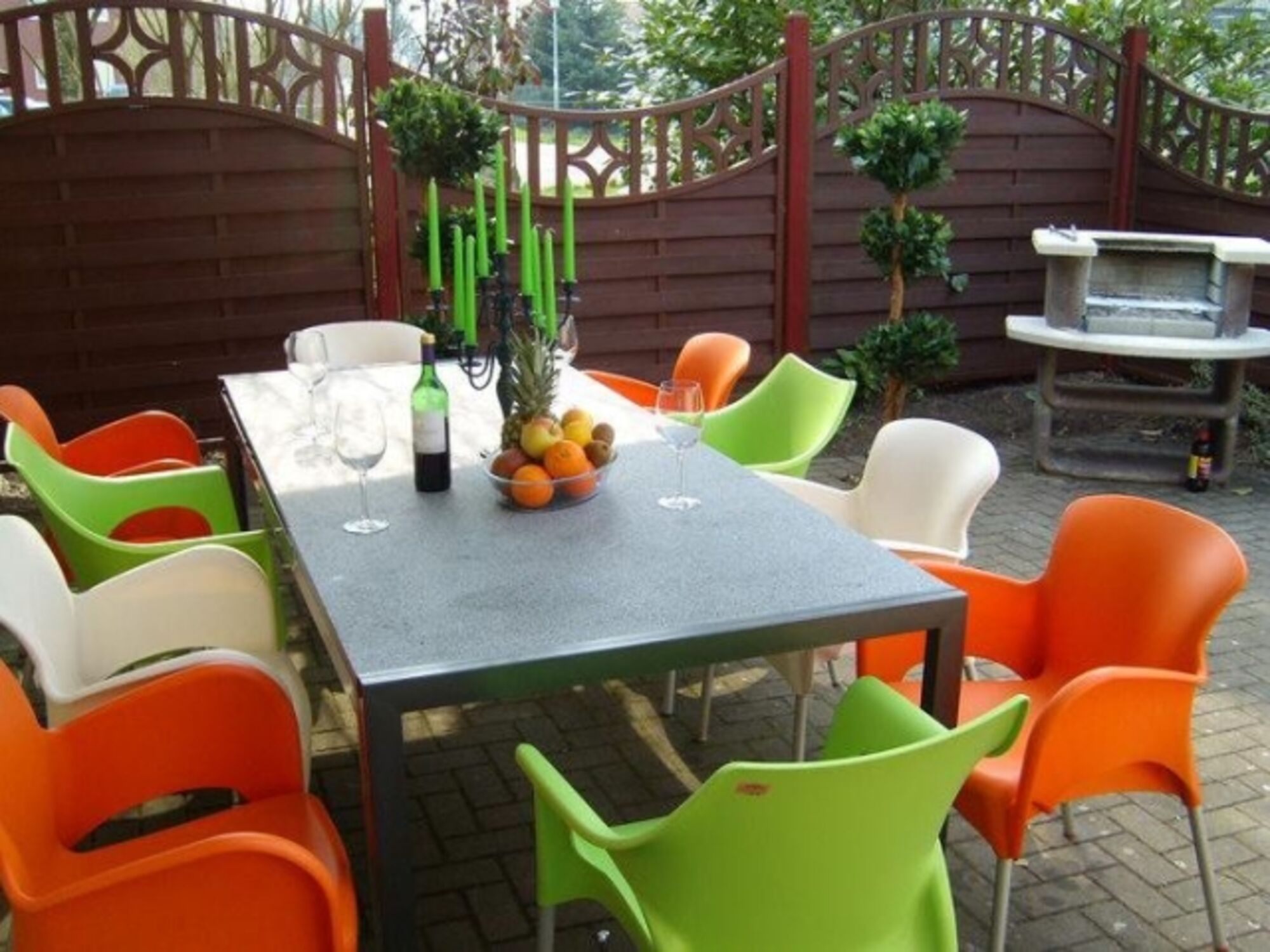 Ein großer Tisch mit 10 Sitzplätzen und Markise runden die gesellige Grillgruppe ab.