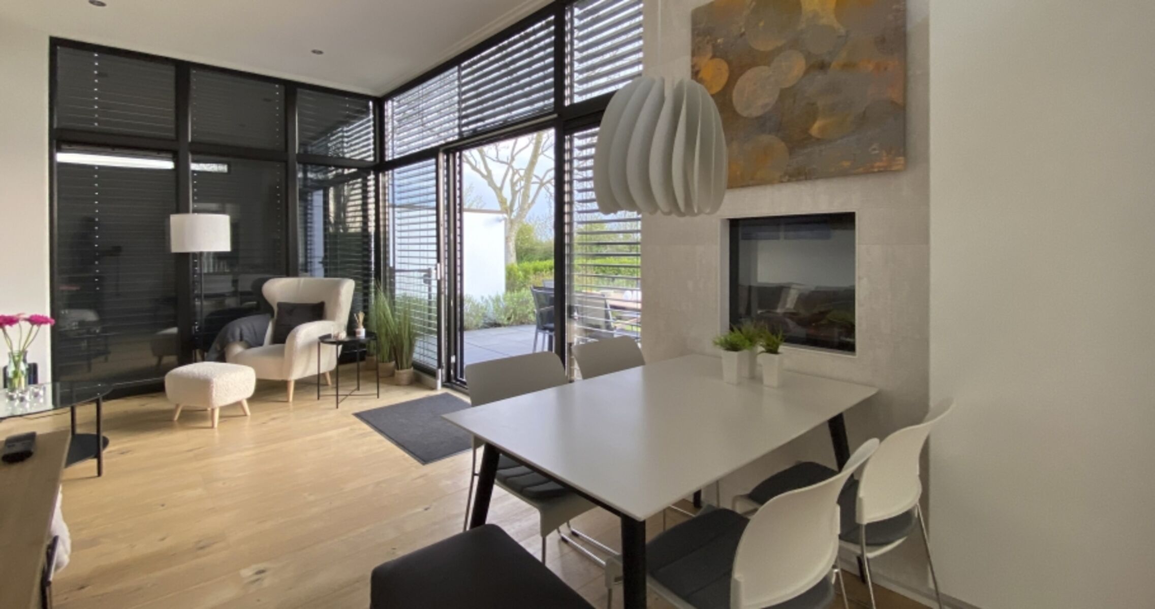 Der großzügige Wohn- und Essbereich, lichtdurchflutet mit bodentiefen Fenstern, verfügt über eine Klimaanlage und über Außenjalousien, sowie über eine offene, voll ausgestattete Küche.