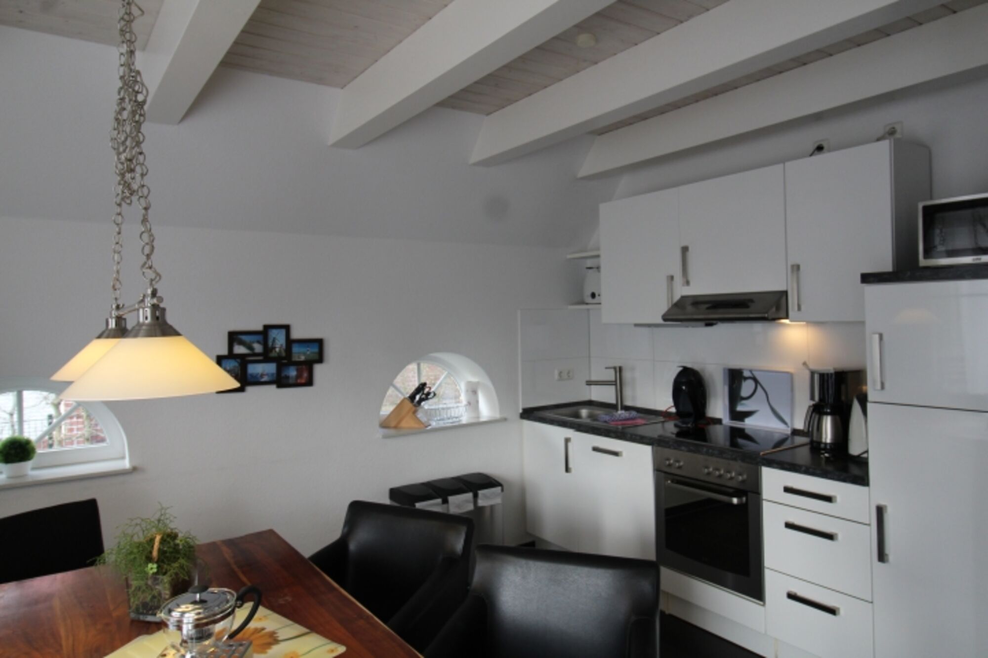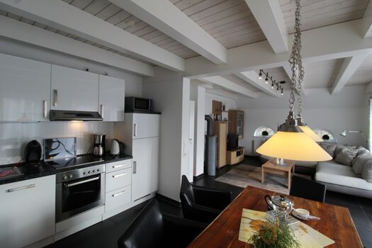 Induktionsherd, Dunstabzugshaube, Kühlschrank mit Gefrierfach, Tassimo-Kaffeautomat, Mixer, Korkenzieher / Flaschenöffner, Gewürze (Salz, Pfeffer, Zucker), Geschirrhandtücher, Mülltüten, Essplatz in der Küche