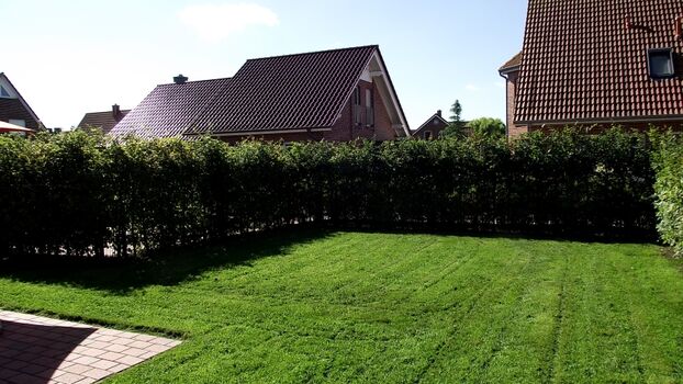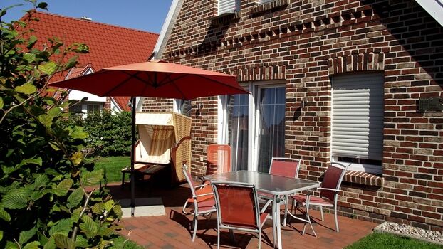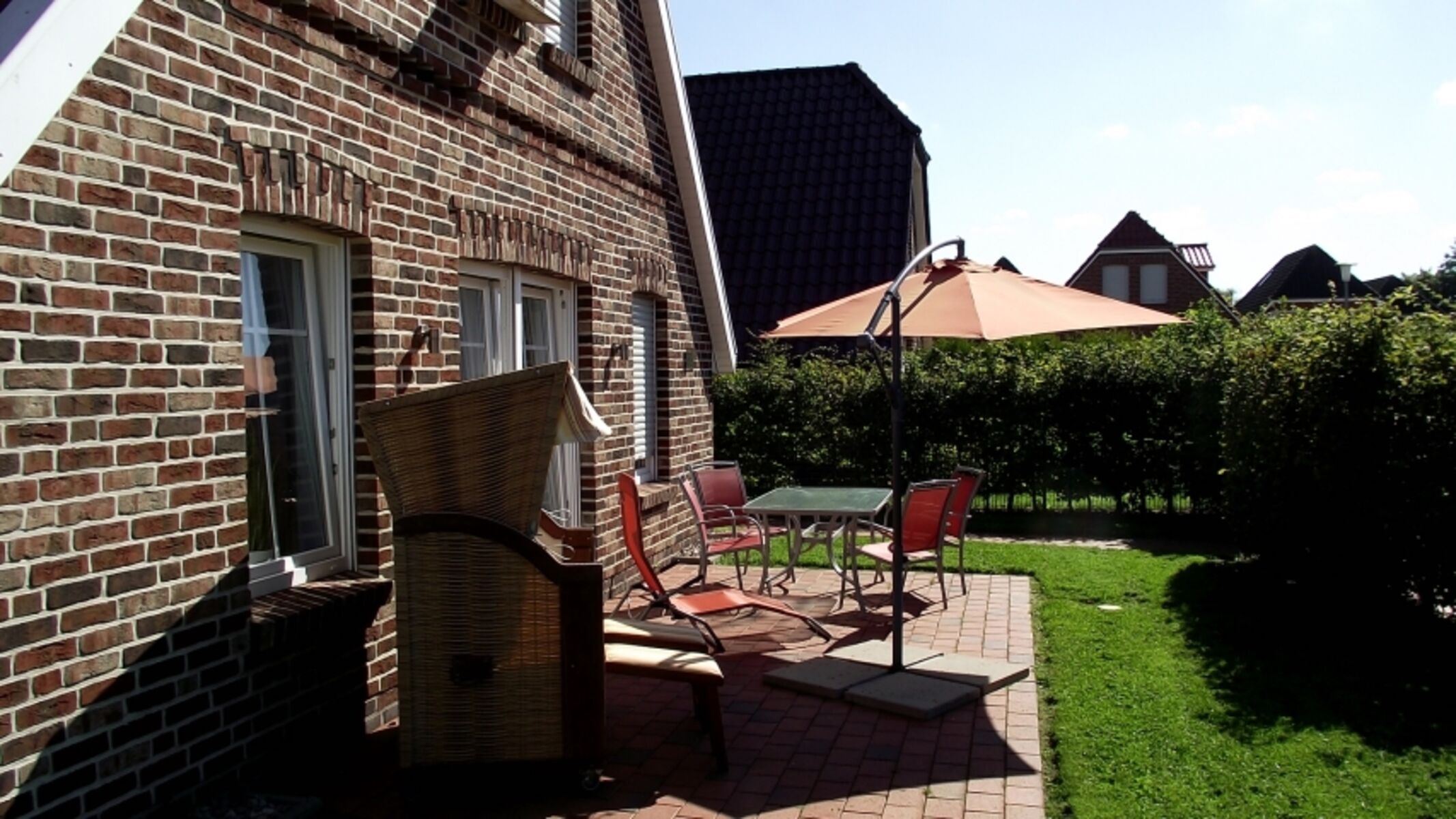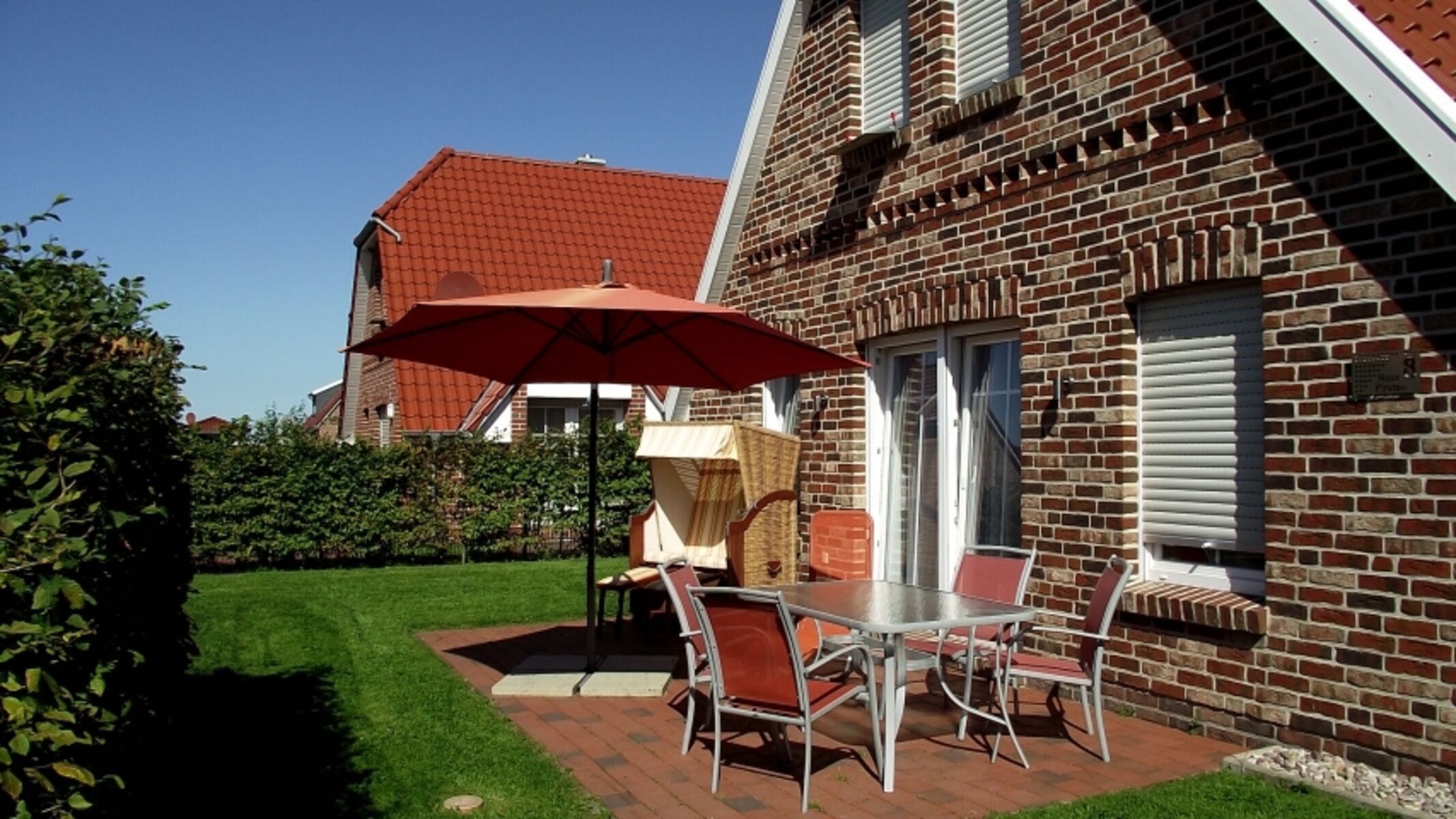 Der großzügige und eingezäunte Garten mit Strandkorb und Terrasse bietet Ihnen die Möglichkeit, die frische Luft zu genießen und sich inmitten der Natur zu erholen.