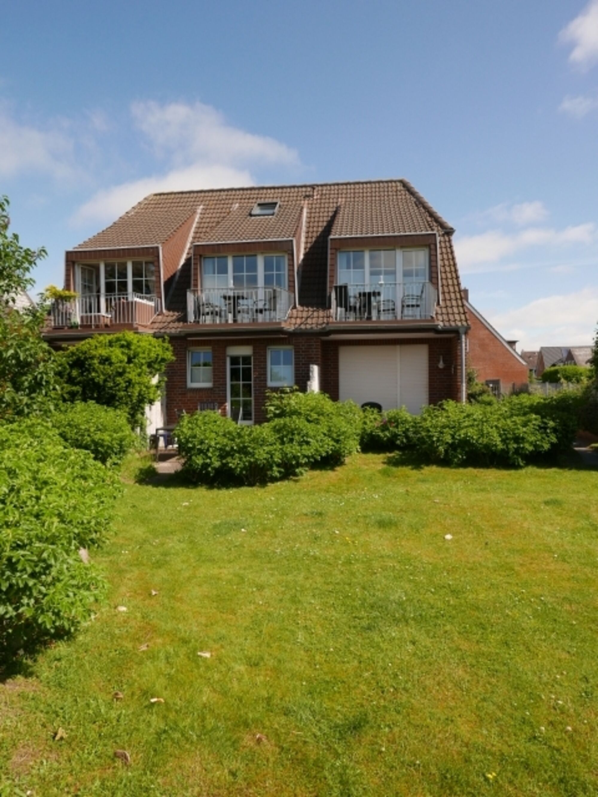 Direkt vor dem Haus befindet sich ein eigener PKW-Stellplatz, dieser gehört zu Ihrer Wohnung. Hinter dem Haus liegt der großzügige Garten in Südlage, dort befinden sich auch die Strandkörbe.