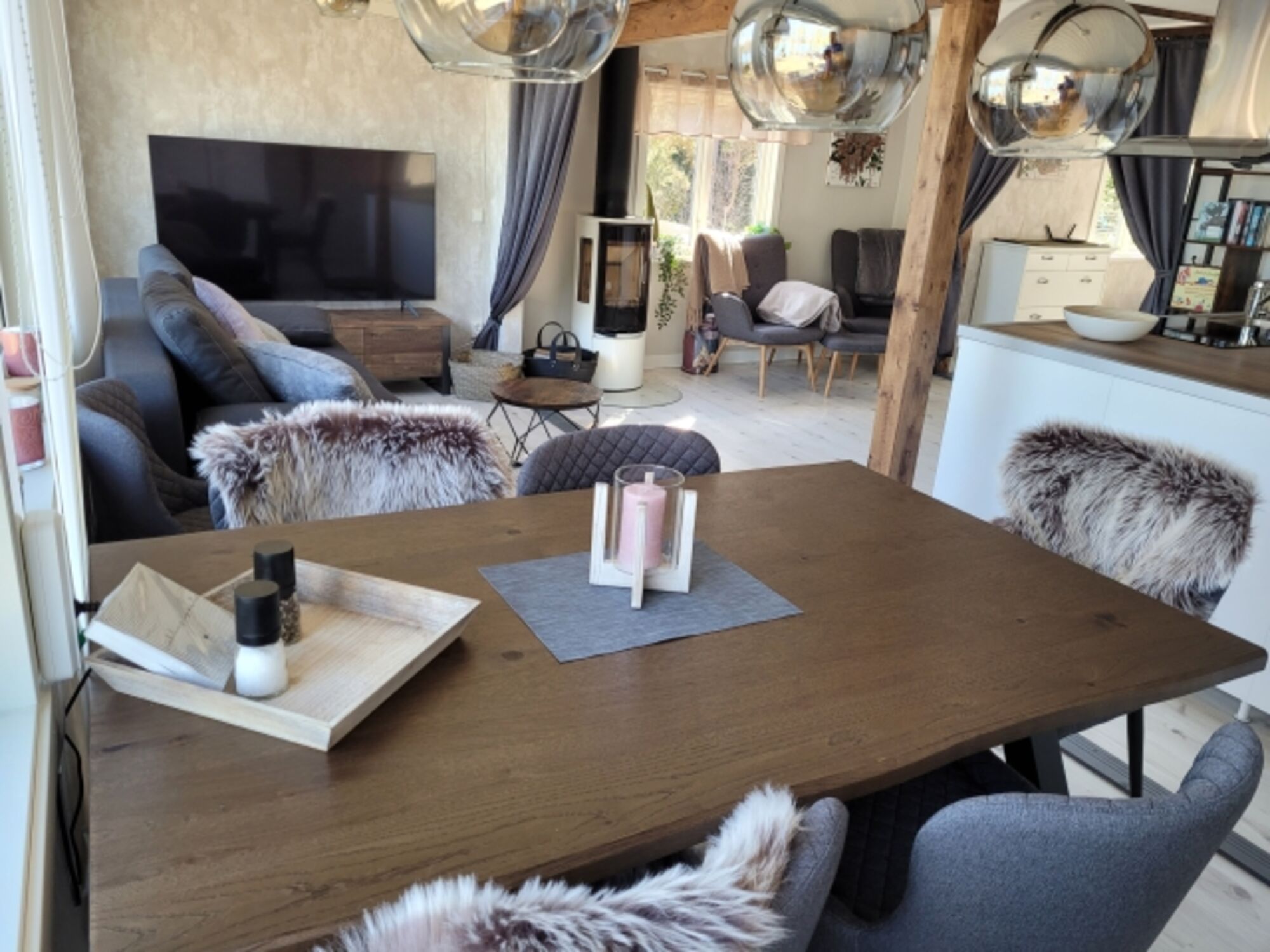 TV-Sat, SMART-TV, TV-Flachbildschirm, Spiele für Spielkonsole, Bücher, Kaminofen, 3er-Sofa, Sessel