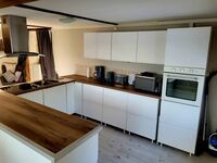 Cerankochfeld, Induktionsherd, Dunstabzugshaube, Gefrierschrank, Mixer, Korkenzieher / Flaschenöffner, Gewürze (Salz, Pfeffer, Zucker), Öl / Essig, Geschirrhandtücher, Mülltüten, Essplatz in der Küche