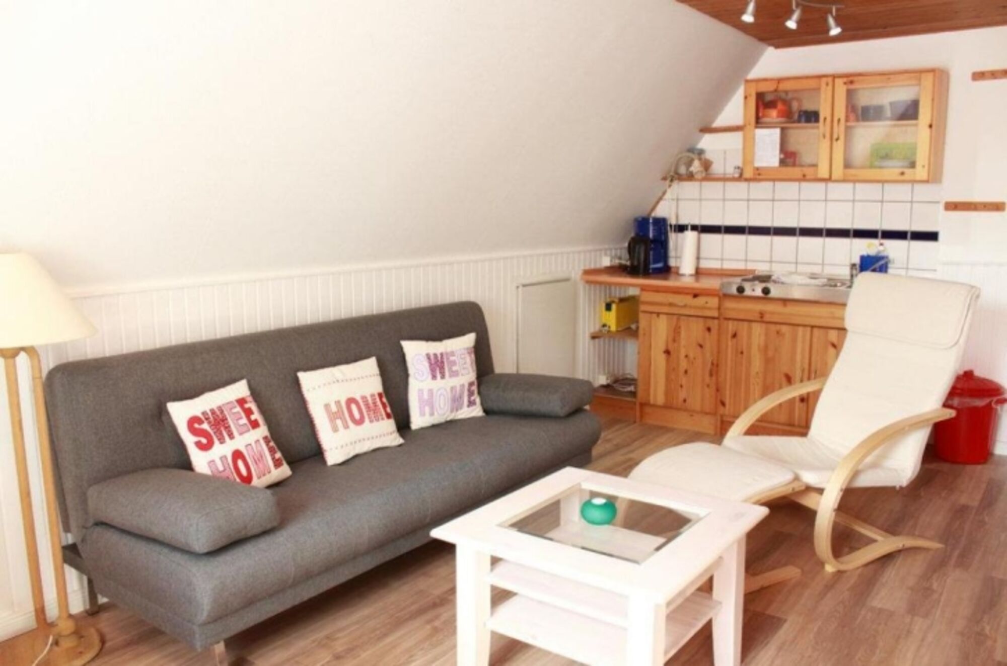 2-Platten Herd, Kühlschrank mit Gefrierfach, Eierkocher, Korkenzieher / Flaschenöffner, Gewürze (Salz, Pfeffer, Zucker), Öl / Essig, Geschirrhandtücher, Mülltüten, Essplatz in der Küche