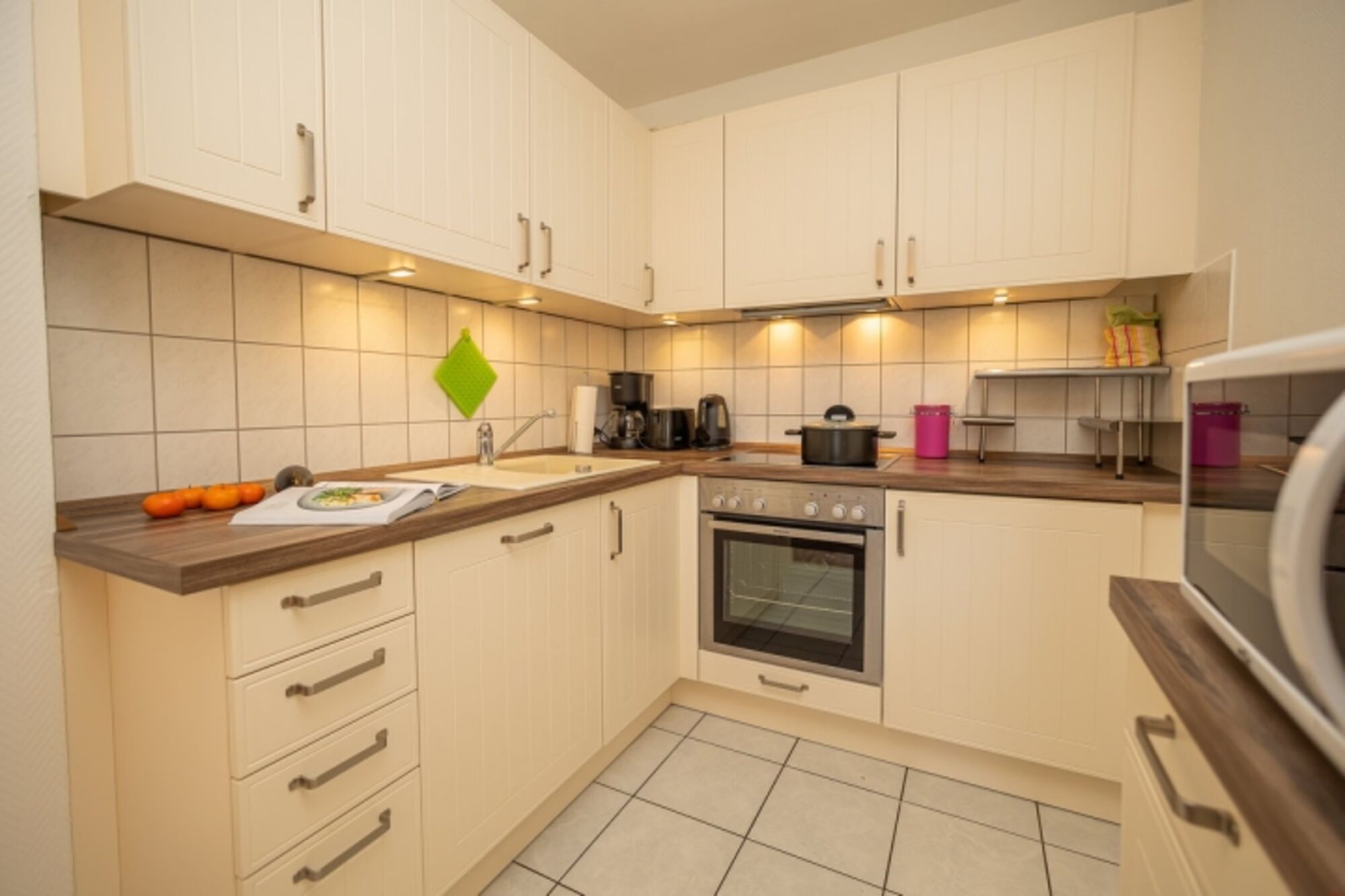 2 Matratzen, ein geräumiger Kleiderschrank und ein Flachbild-Fernseher. Das komplett neu renovierte Bad verfügt über ebenerdige Dusche, Waschbecken und WC. Die Küche ist komplett ausgestattet inkl. Mikrowelle und Geschirrspüler.