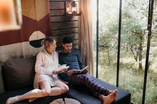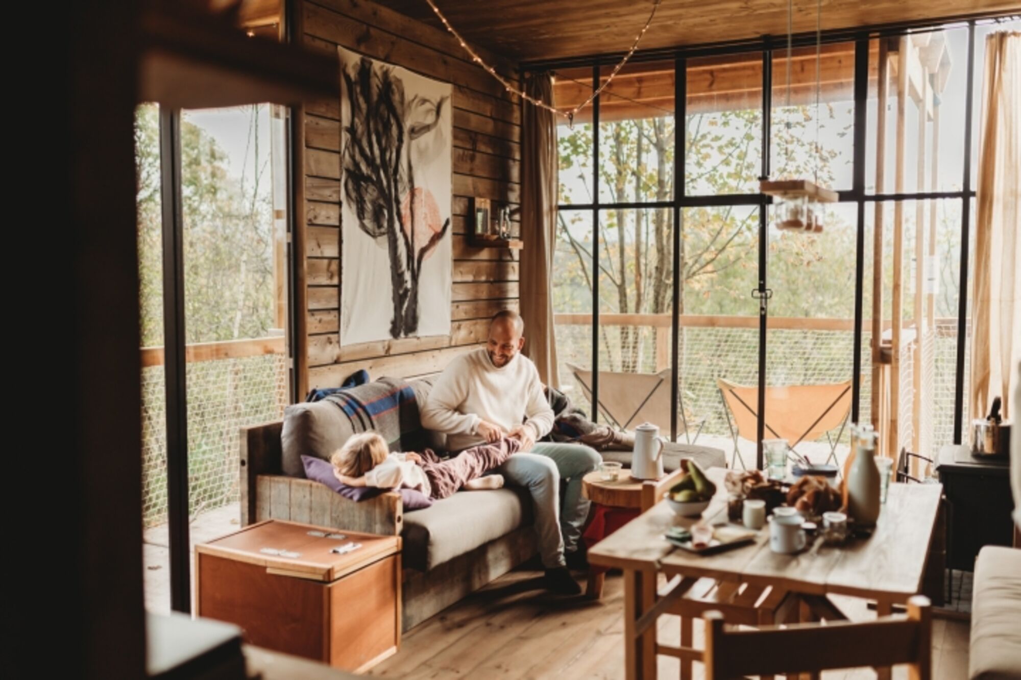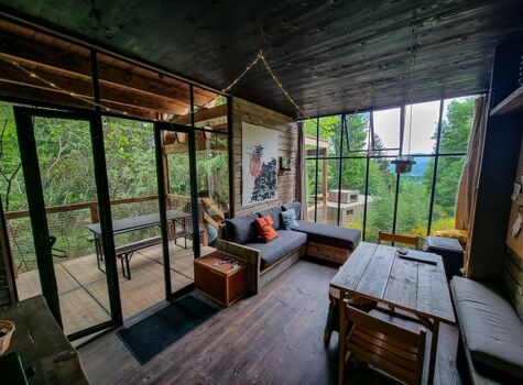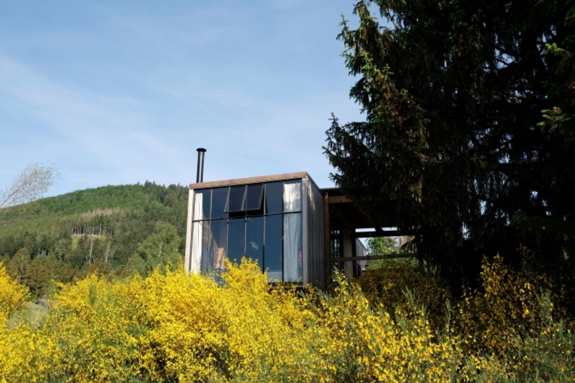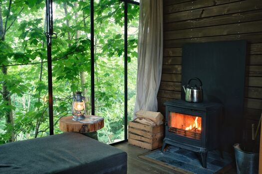 Jede Cabin hat ein großes Stahlfenster, das eine tolle Aussicht bietet und dich mit der Natur in Verbindung bringt. Der perfekte Ort, um es sich gemütlich zu machen, zu entspannen und den Moment zu genießen. Für den ultimativen Hauch von Gemütlichkeit haben alle unsere Cabins eine offene Gestaltung mit Vorhängen, die den Schlafbereich vom Wohnbereich trennen.