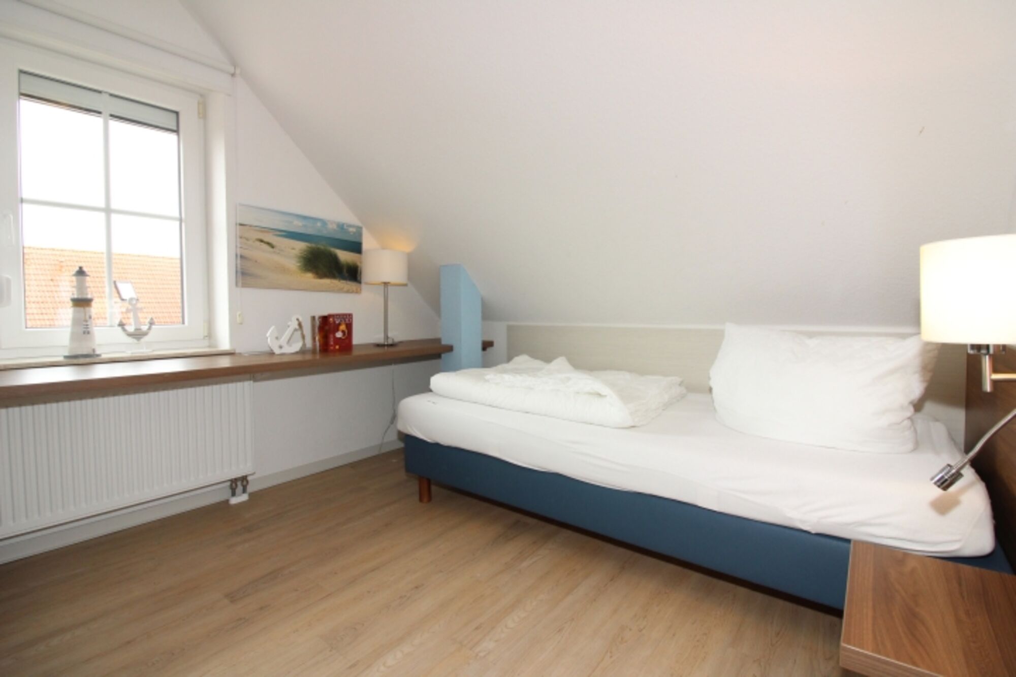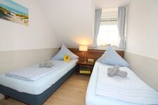 Im Dachgeschoss befindet sich ebenfalls ein Schlafraum mit 2 getrennten Betten, Kleiderschrank , Fernseher und Schreibtisch.