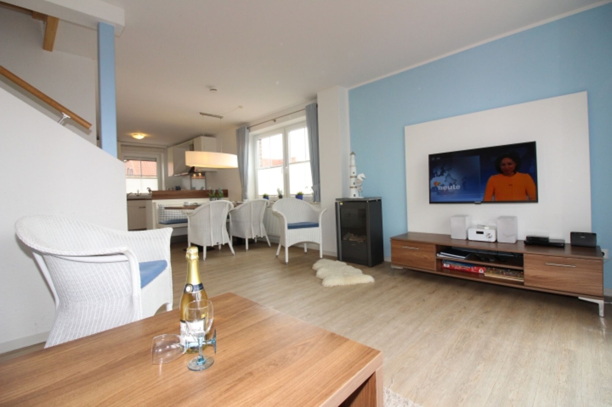 Der Wohnbereich bietet einen Gaskaminofen, eine Sitzecke mit einem großen Sofa, Couchtisch und zwei Sesseln. Ein Flachbildfernseher, ein DVD-Player, eine HiFi-Anlage sowie Spiele sorgen für Unterhaltung.