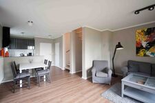 In der offenen Küche ist eine Spülmaschine integriert und wirkt modern und aufgeräumt.