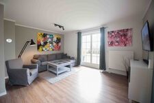 Ein großer Flachbildschirm wie eine Soundbar sind im Wohnbereich vorhanden.