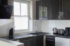 Cerankochfeld, Dunstabzugshaube, Kühlschrank mit Gefrierfach, Senseo-Kaffeeautomat, Korkenzieher / Flaschenöffner, Essplatz in der Küche