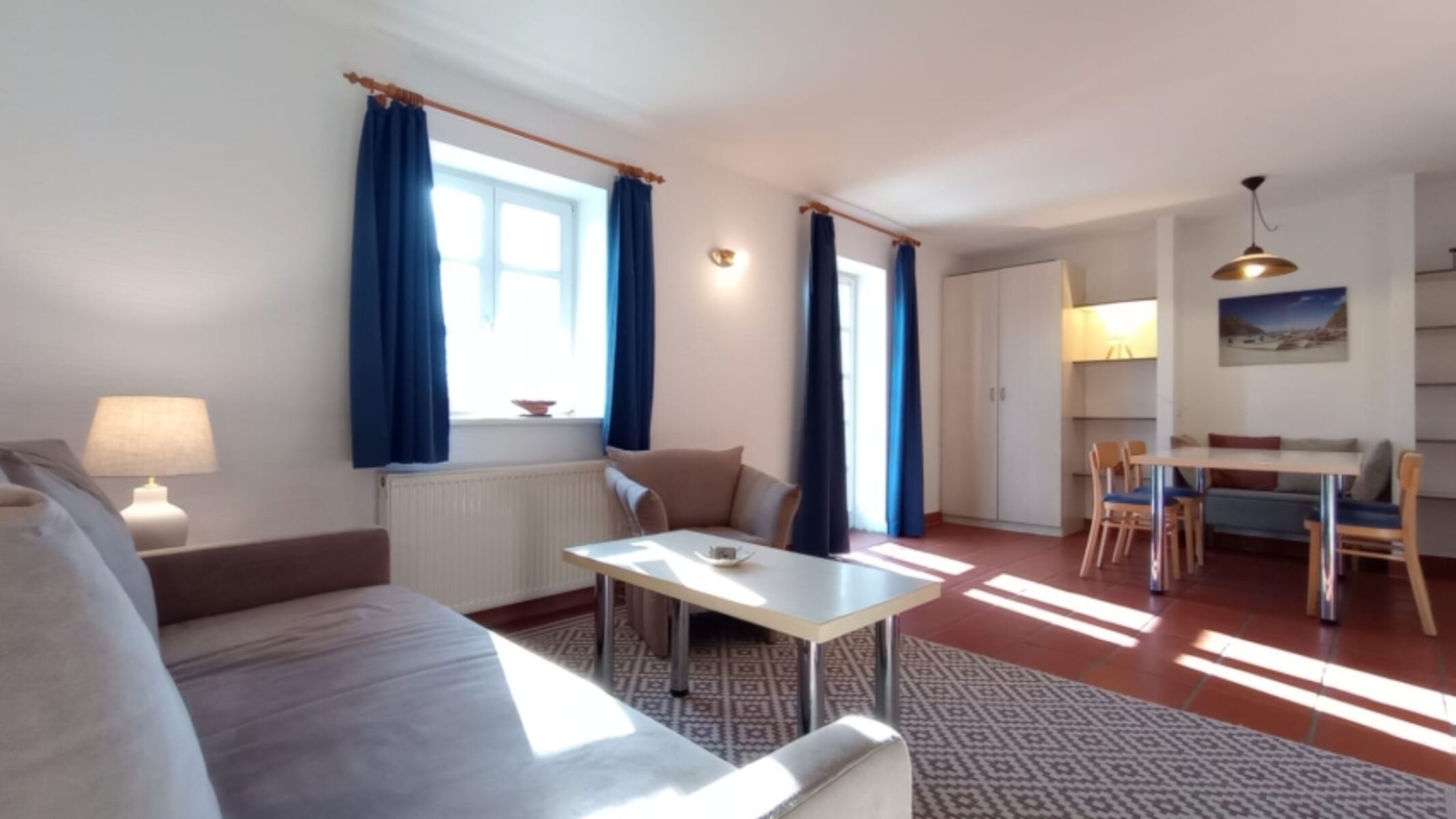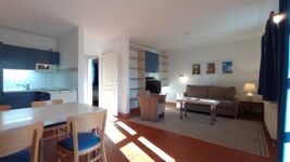 Freundlich gibt sich das Wohnzimmer mit gut ausgestatteter Einbauküche. U.a. finden Sie hier einen Kühlschrank mit Gefrierfach und einen Geschirrspüler. Einbaumöbel sorgen für ein luftiges Ambiente, zeitloser Terracotta-Boden für Behaglichkeit. Im Schlafzimmer finden Sie ein Doppelbett mit guten Matratzen, im Wohnzimmer ein Sofa, das sich zum 1,40m breiten Bett mit hohem Liegekomfort ausklappen lässt. Es handelt sich um eine Nichtraucherwohnung im Erdgeschoss.
