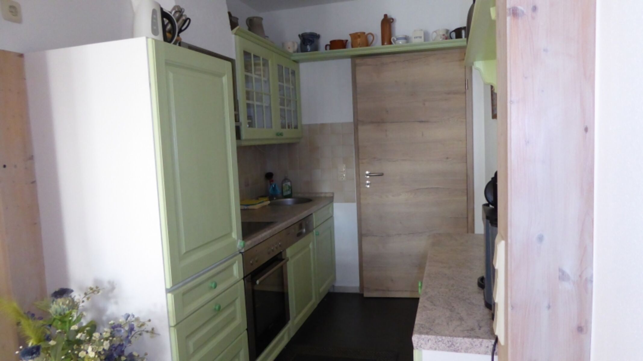 Cerankochfeld, Dunstabzugshaube, Kühlschrank mit Gefrierfach, Eierkocher, Mixer, Korkenzieher / Flaschenöffner, Gewürze (Salz, Pfeffer, Zucker), Geschirrhandtücher, Mülltüten