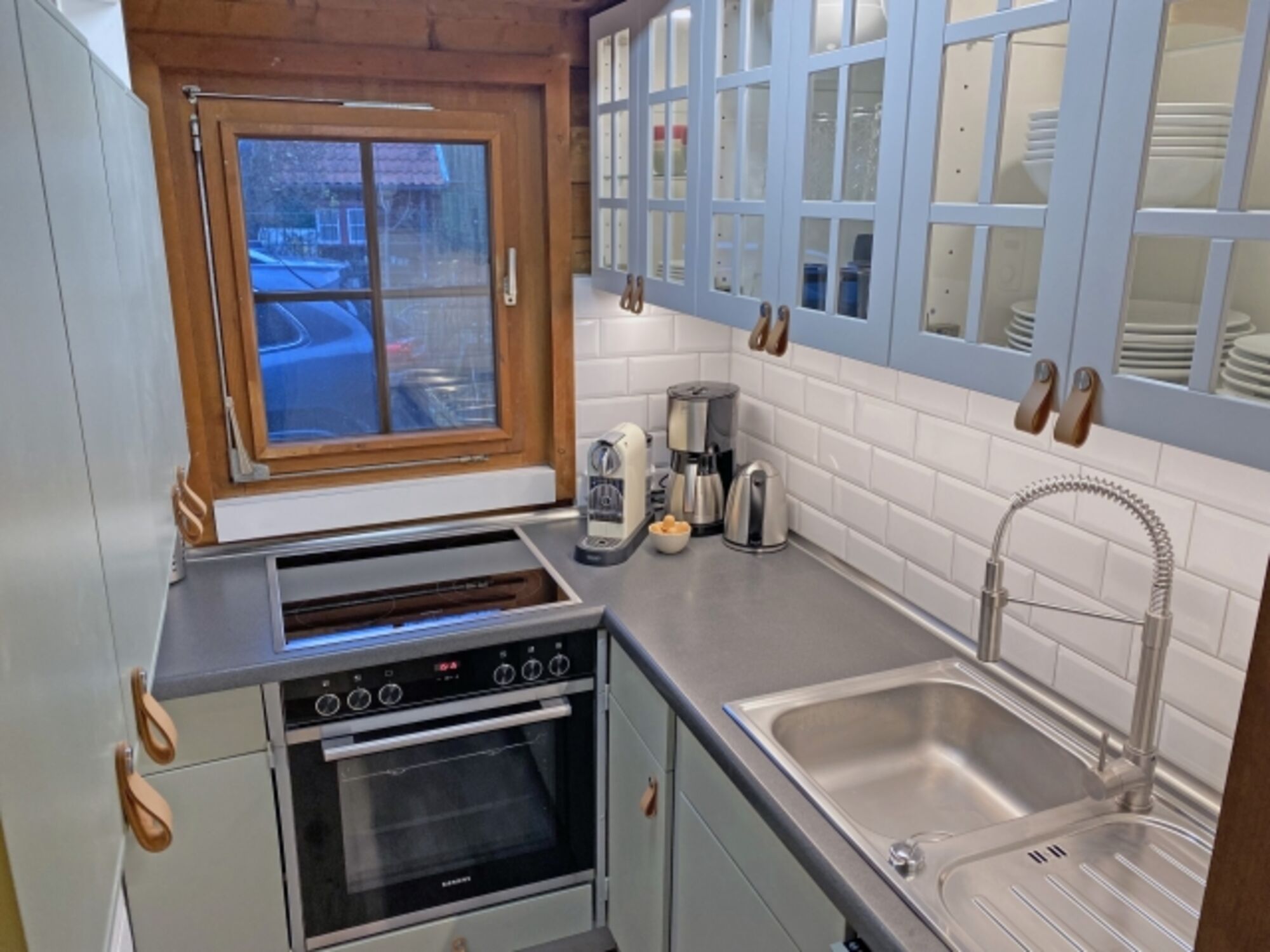4-Platten Herd, Induktionsherd, Dunstabzugshaube, Gefrierschrank, Nespresso-Automat, Korkenzieher / Flaschenöffner, Gewürze (Salz, Pfeffer, Zucker), Öl / Essig, Mülltüten