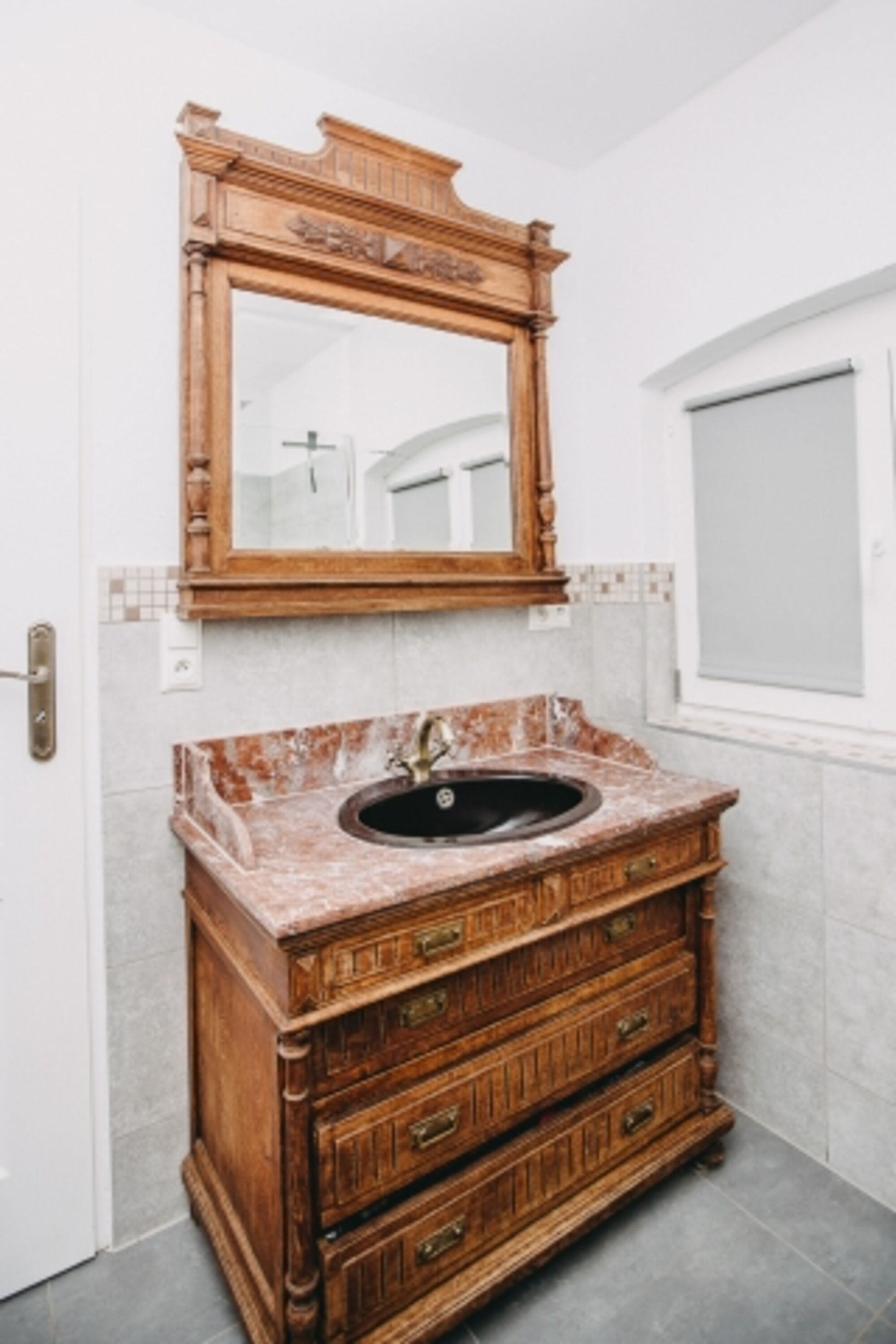 Waschbecken, Spiegel, Fenster im Bad