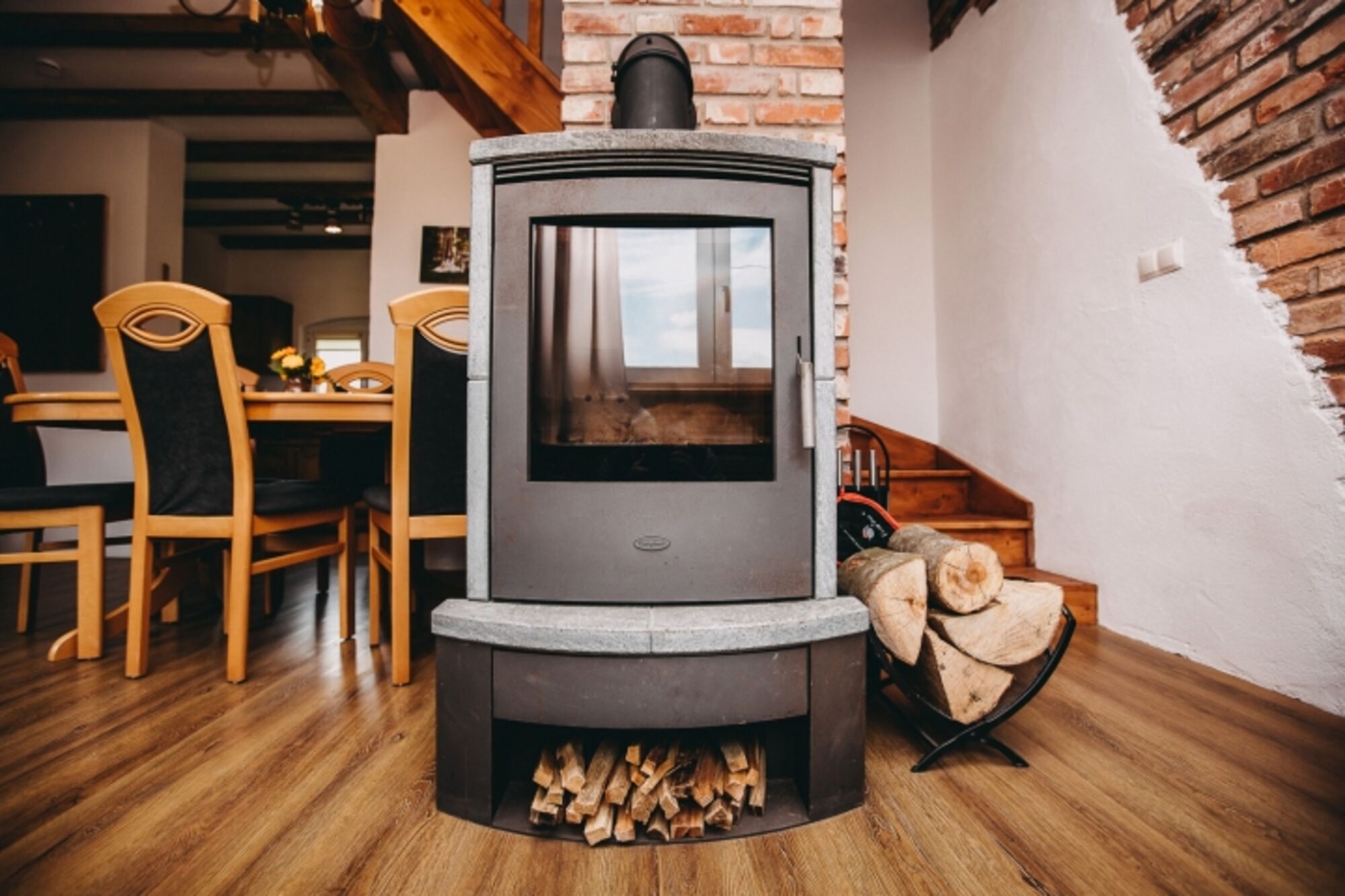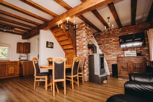 *gemütliches Wohnraum mit Essecke, bequeme Sitzmöglichkeit, LED Fernseher und Kaminofen