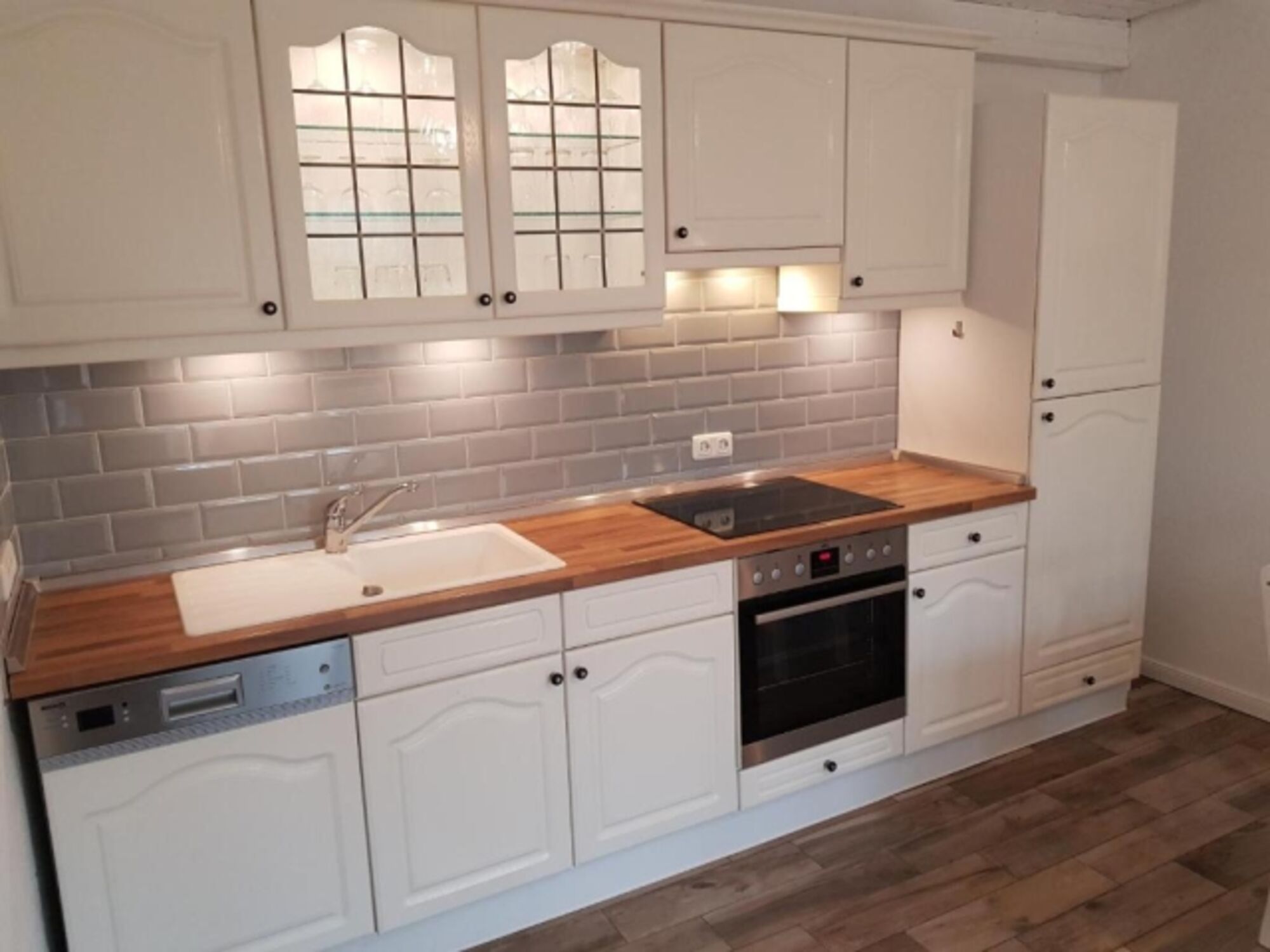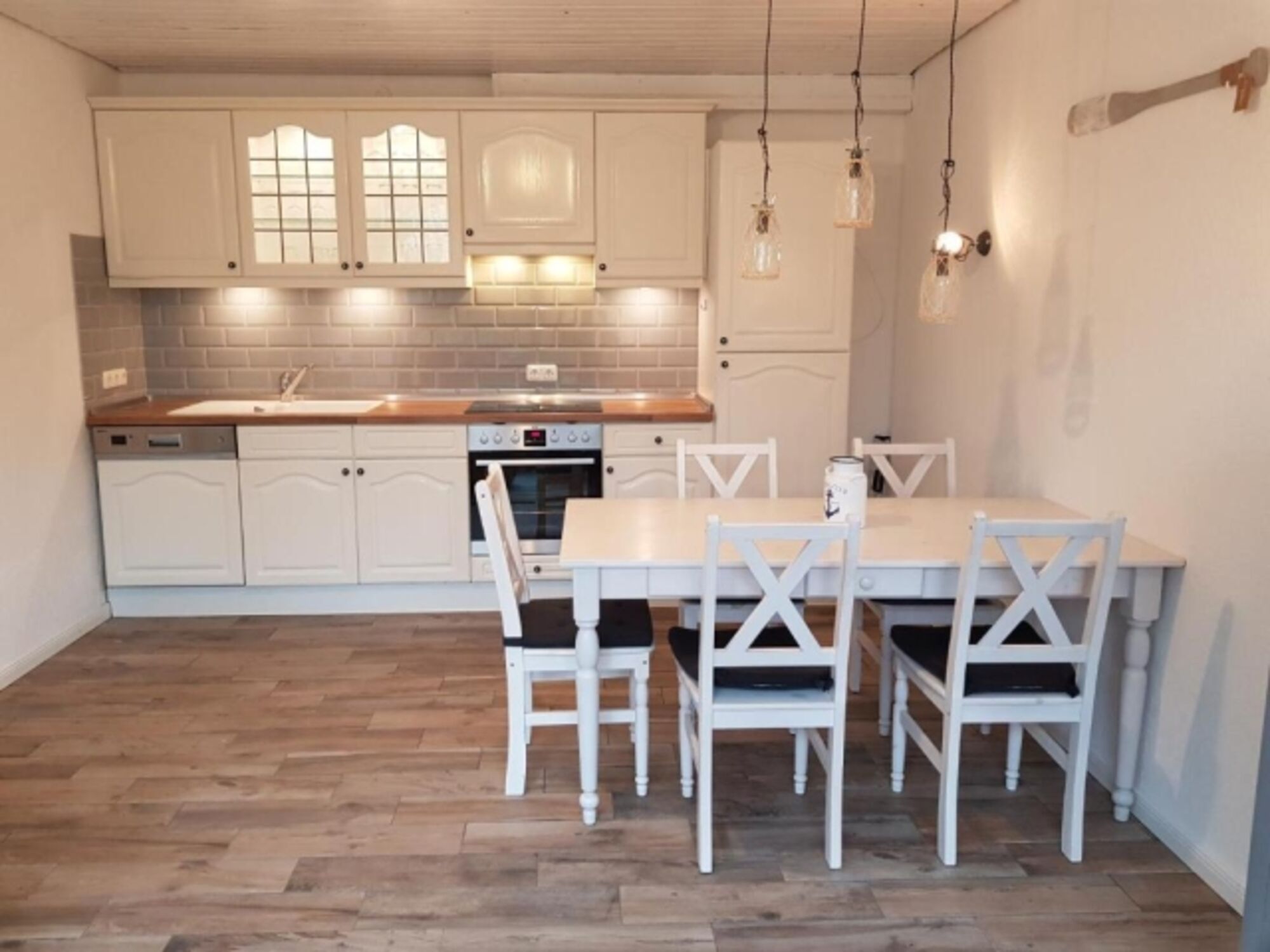 Cerankochfeld, Dunstabzugshaube, Kühlschrank mit Gefrierfach, Mixer, Korkenzieher / Flaschenöffner, Gewürze (Salz, Pfeffer, Zucker), Essplatz in der Küche