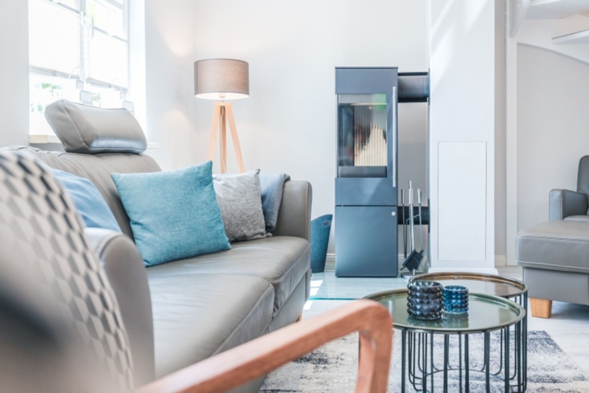 Im Wohnbereich lädt ein Kaminofen in der kalten Jahreszeit zum Verweilen ein. Auf einem gemütlichen Sofa und Sesseln können Sie gemeinsam die Zeit genießen. Dazu ermöglicht Ihnen ein großer Smart -TV zeitgemäßes Entertainment.
