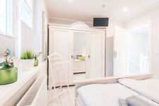 Über eine breite komfortable Treppe erreichen Sie die obere Etage mit zwei behaglichen Schlafzimmern. Das größere von beiden ist mit einem komfortablen Doppelbett, einem großzügigen Kleiderschrank sowie einen schwenkbaren Smart-TV ausgestattet. Das zweite Schlafzimmer besticht mit seinem maritimen Flair. Ein großes Dachfenster lässt viel Licht in den Raum mit zwei Einzelbetten, einem Kleiderschrank, einem kleinem Sekretär und einem weiteren schwenkbaren Smart- TV.